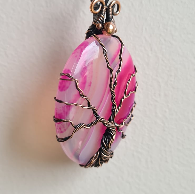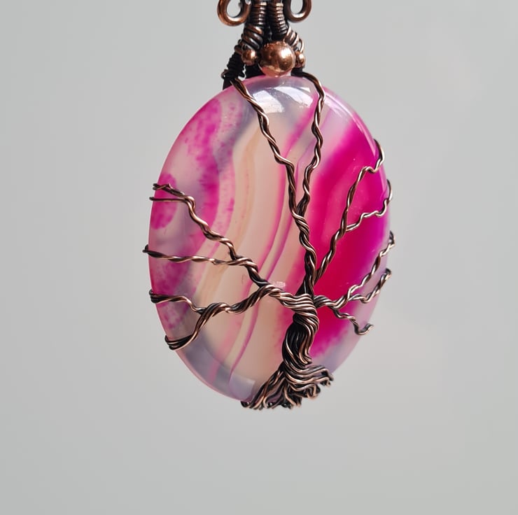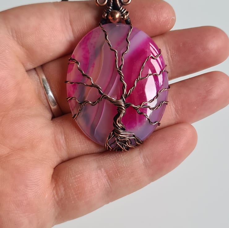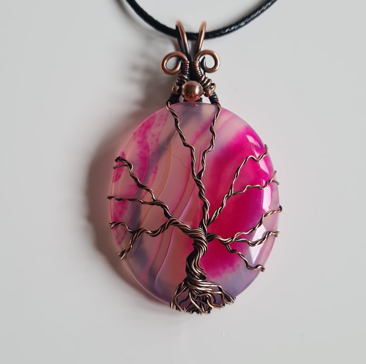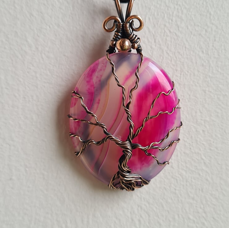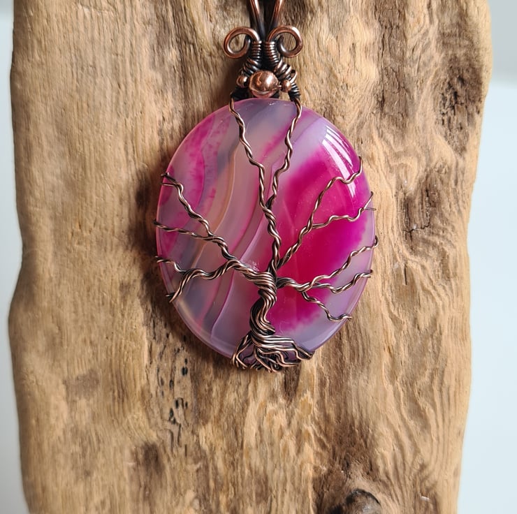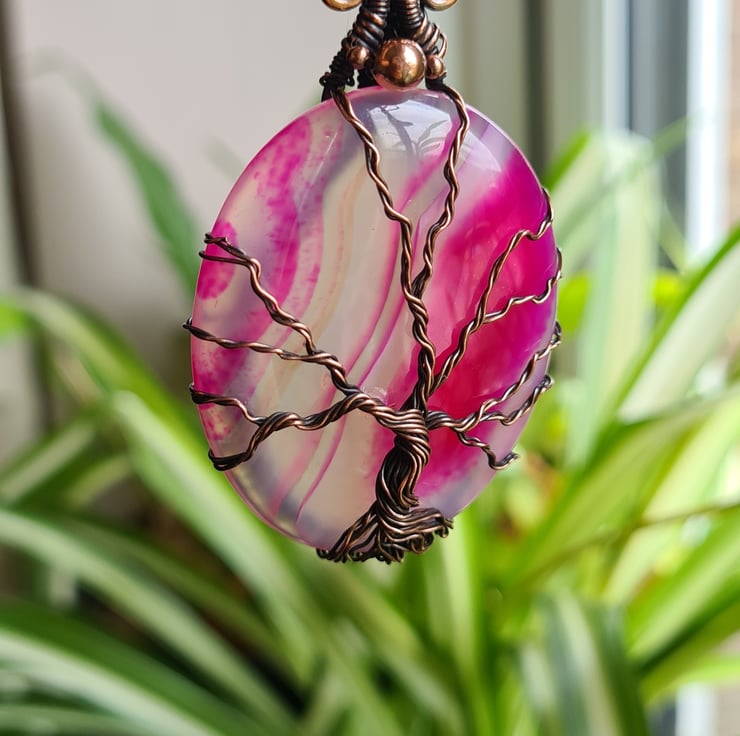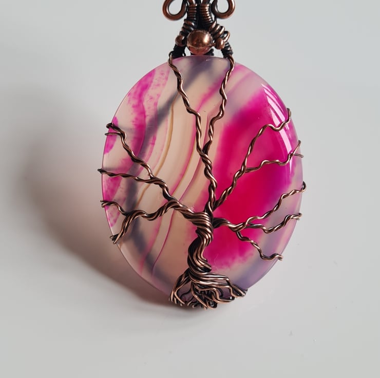 I have created this stunning and very unique Tree of Life Statement pendant using this beautiful piece of Natural (dyed) Pink Agate crystal, which I have wrapped with copper featuring this gorgeous copper tree to the front.