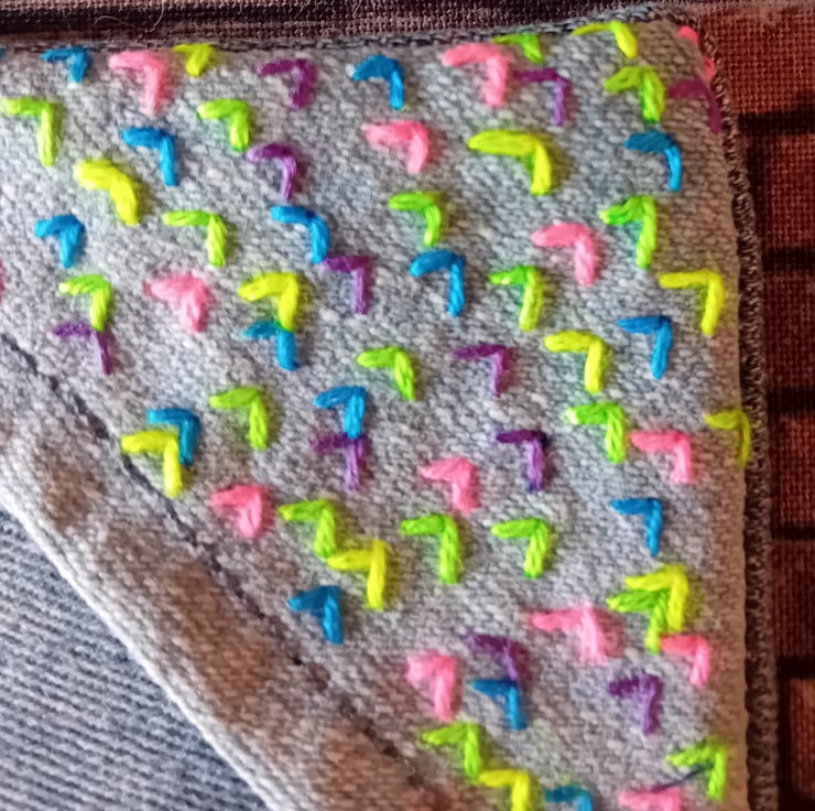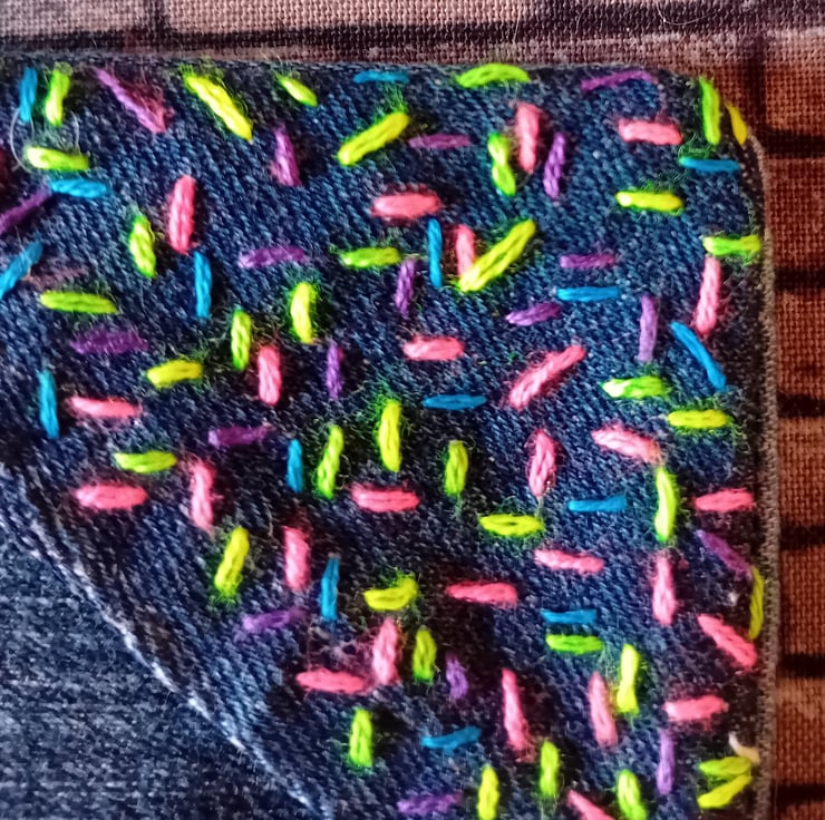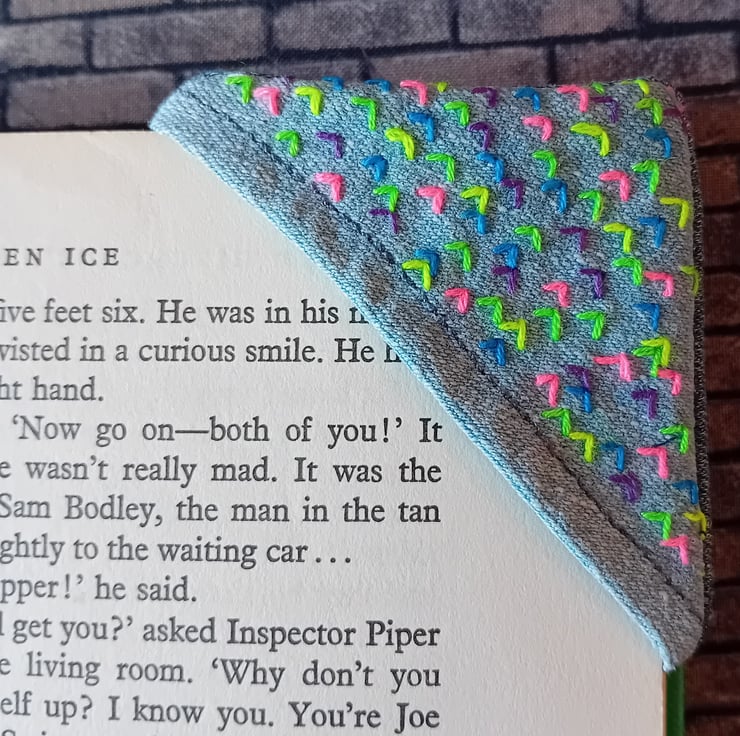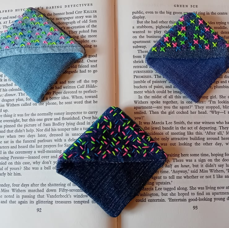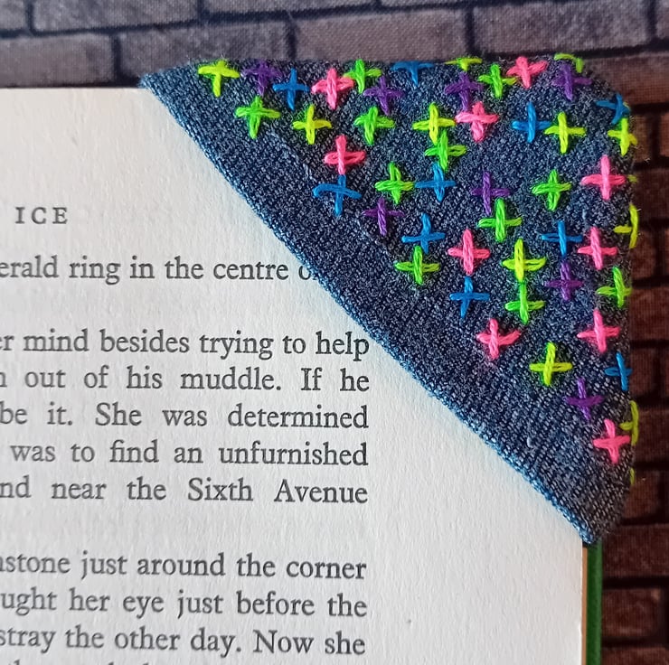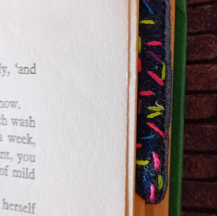This bookmark was created using repurposed denim, giving it a second life, while neon embroidery stitches add a bold contrast that makes each piece pop.