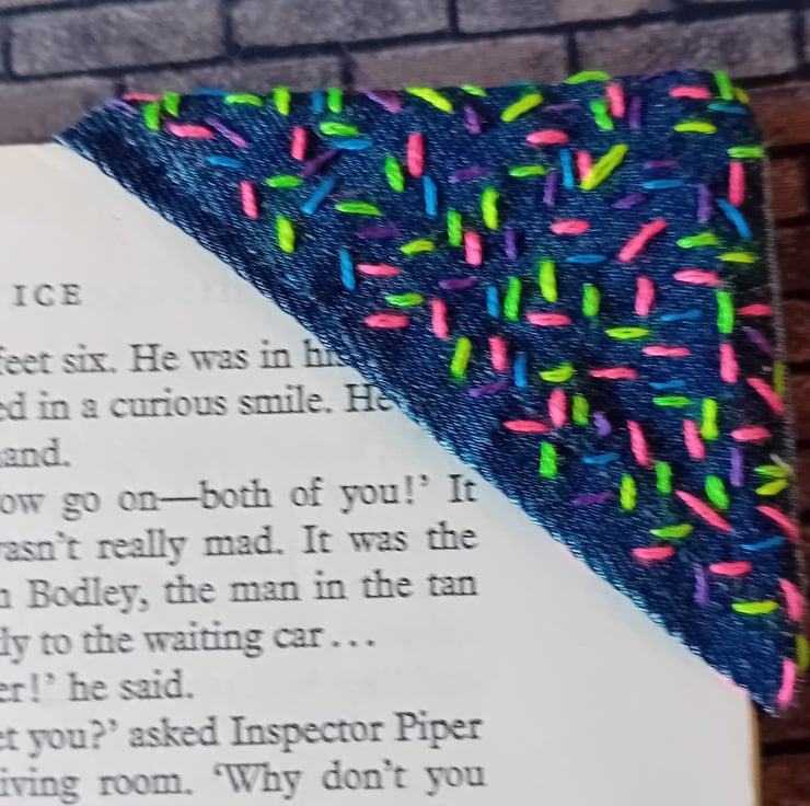 This denim bookmark is a perfect mix of rugged and vibrant—made from upcycled denim and brought to life with neon embroidery stitches that pop against the dark fabric.