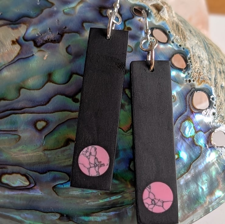 These beautiful, hand crafted resin earrings are set with Pink Turquoise and hang from Stirling Silver findings. These earrings hang almost 3" (7 cm) in total, including wires.
