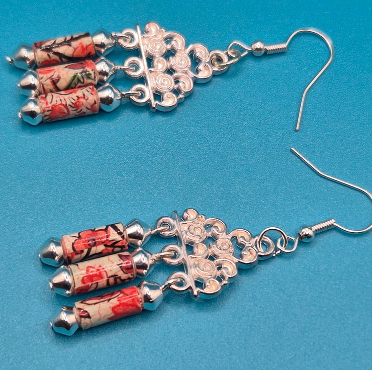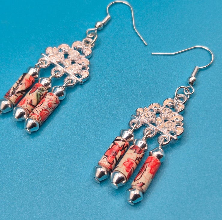 Statement earrings made with hand rolled paper beads on an ornate earring findings complemented with small silver beads