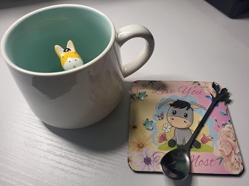 Handmade cute donkey theme gift set, which includes the mug, an own designed coaster and a tea spoon. The pack comes as seen in the picture, but gift box option/personalisation can be available.