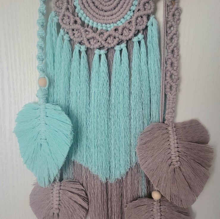 Handmade macrame wall decor with a half mandala combined with macrame leaves.