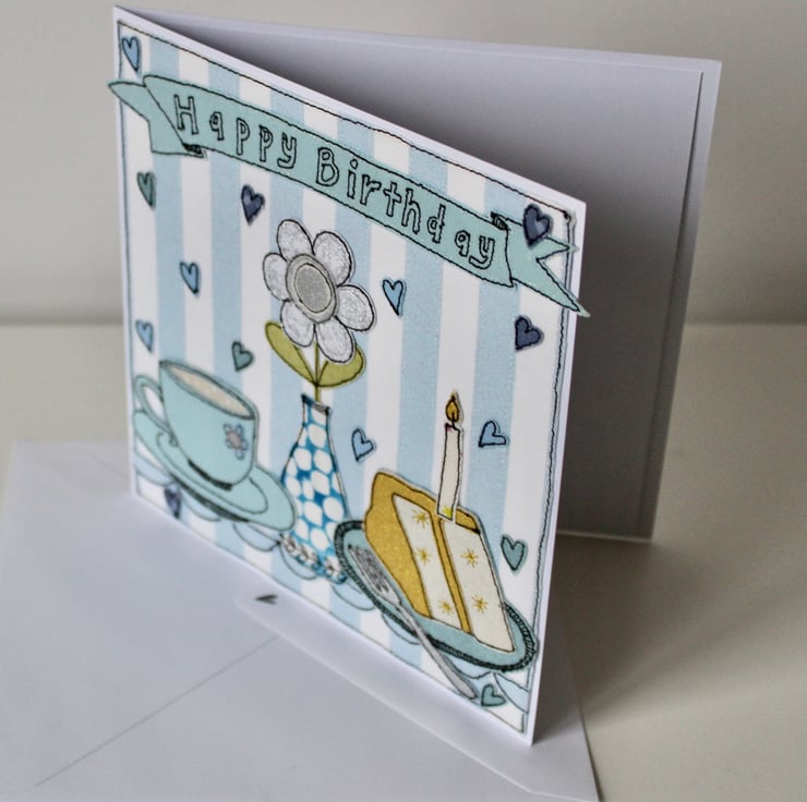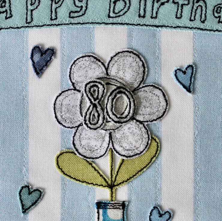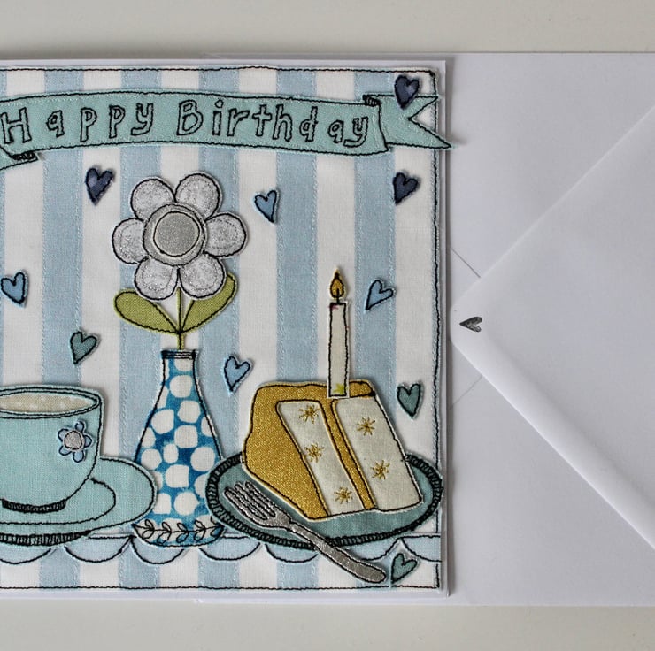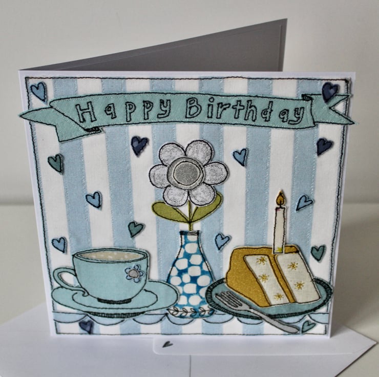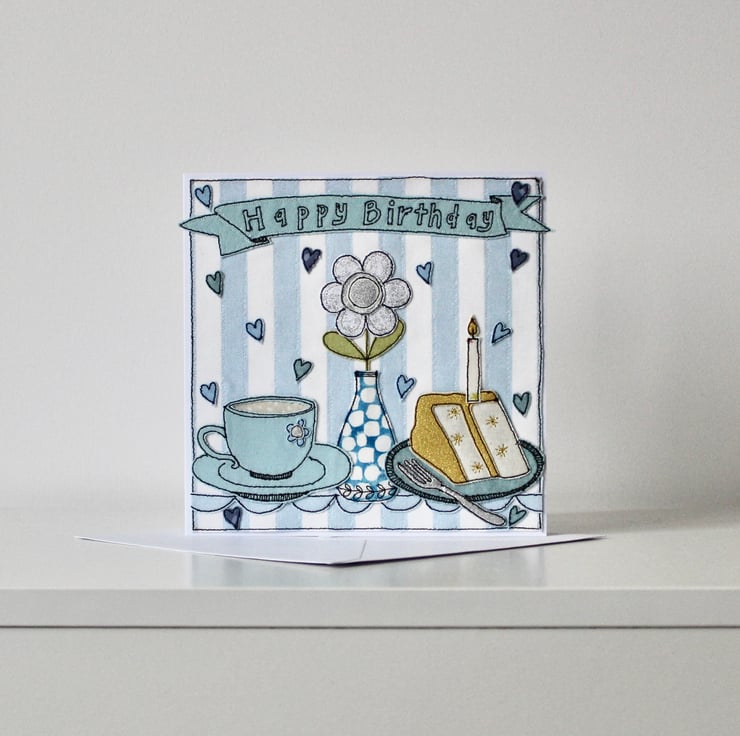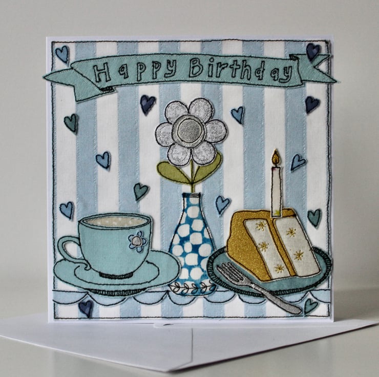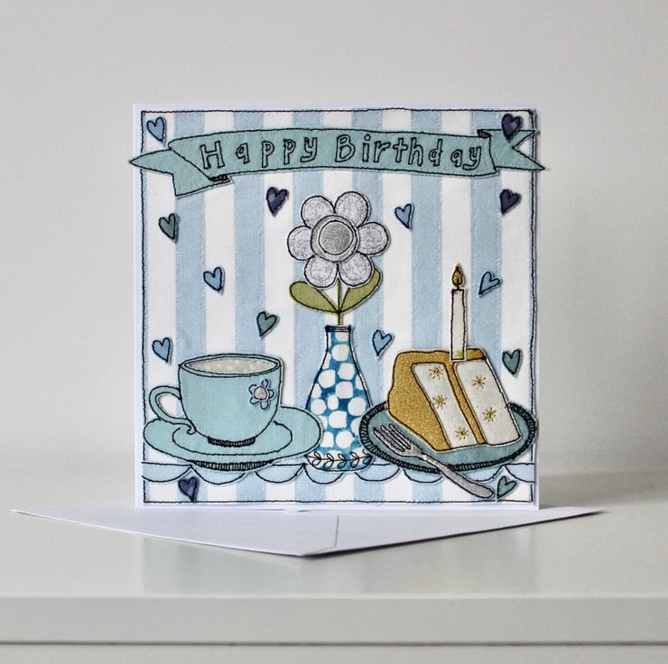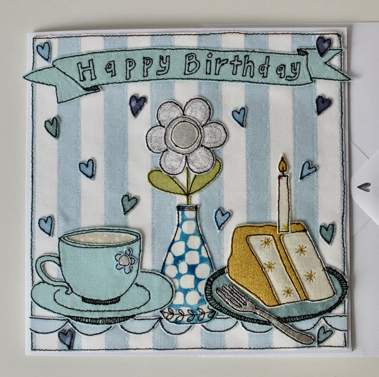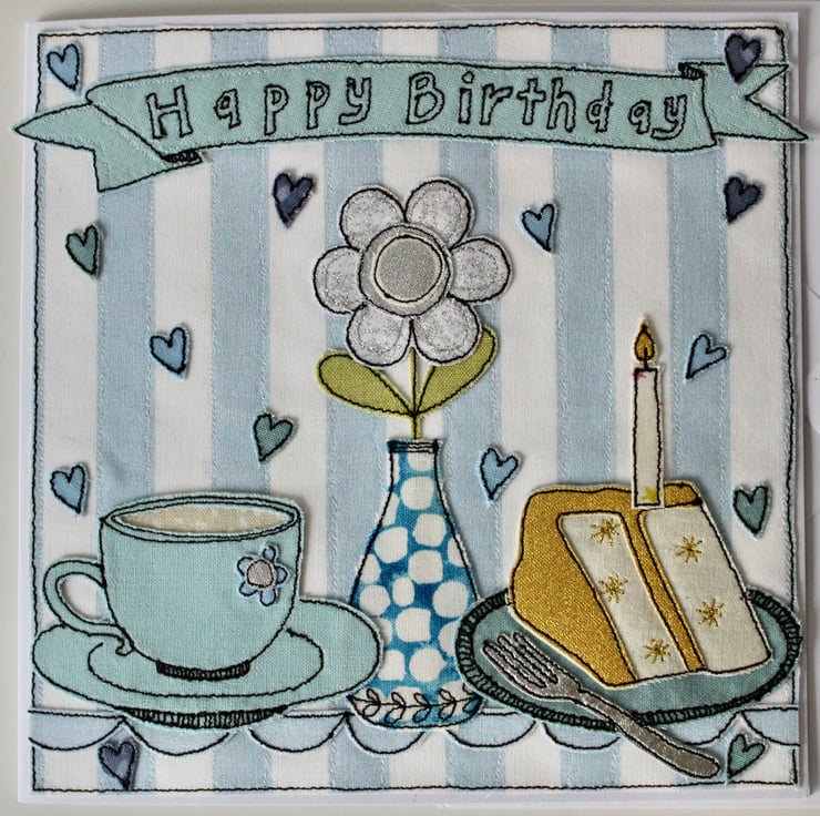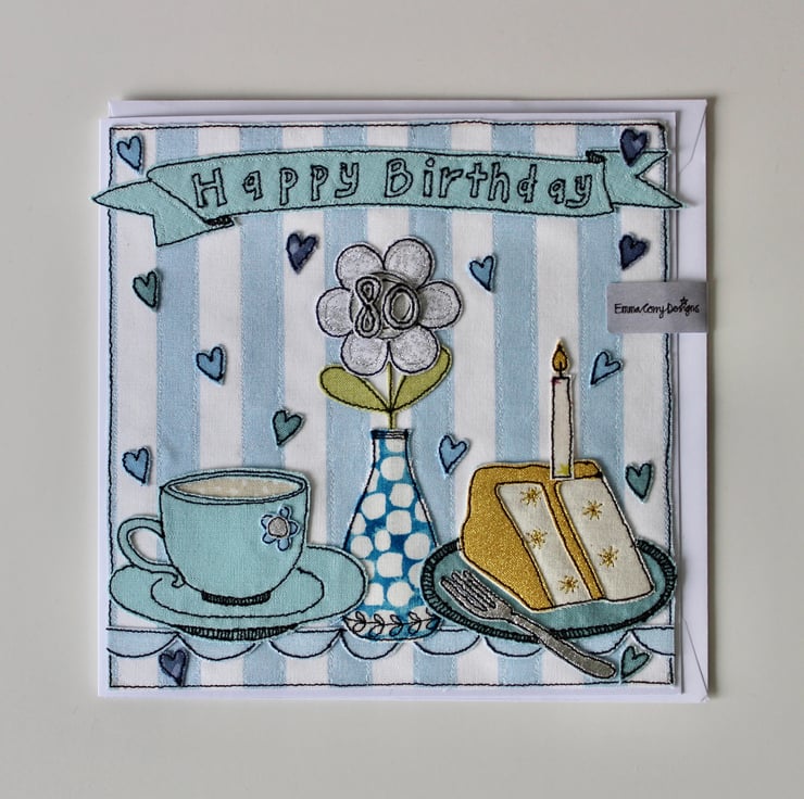 A handmade card which includes a cup of tea, a slice of cake, a candle, a bloom in a vase, hearts and with the sewn words 'Happy Birthday' and the number '80'.