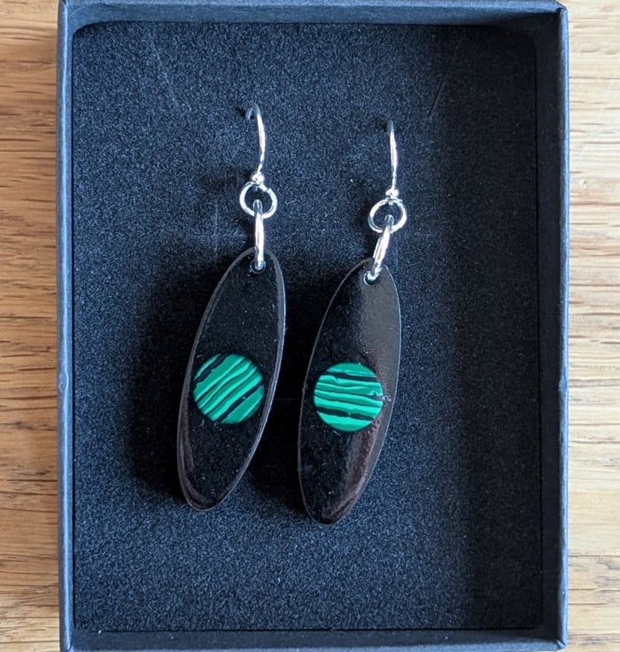 These beautiful, hand crafted resin earrings are set with Malachite and hang from Stirling Silver findings. These earrings hang at 2.5" (6 cm) in total, including wires.