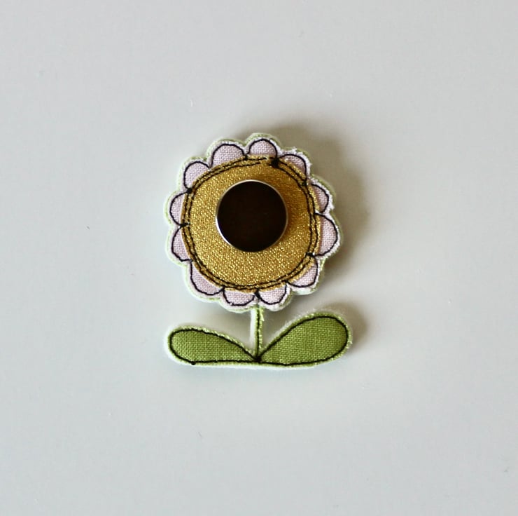 Flowers are sewn using cotton cloth, 100% wool felt and free hand machine embroidery; multiple layers of cloth are sewn together and cut out by hand using sharp scissors. The magnets on the back are attached with hot glue.