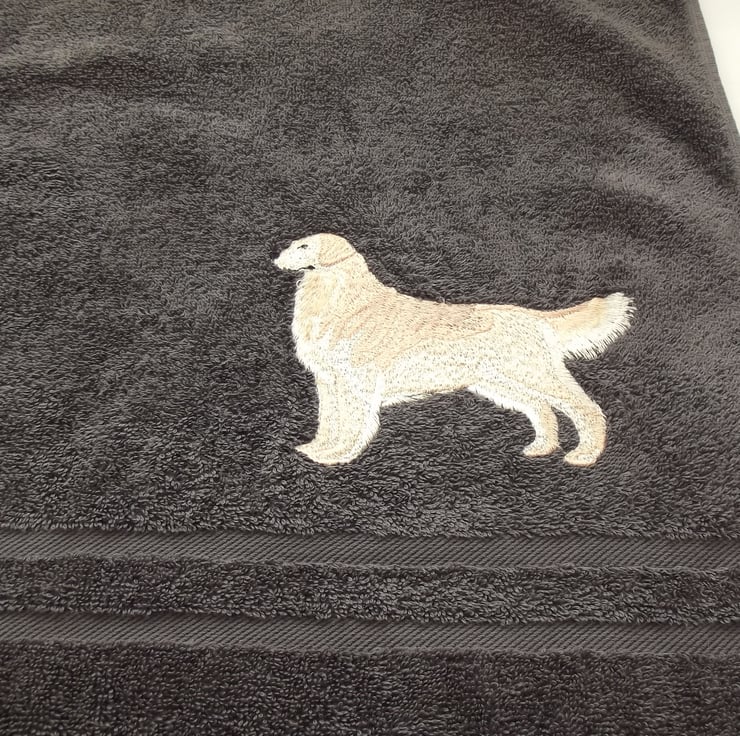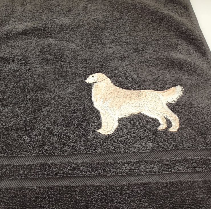 Machine Embroidered by me. Golden Retriever Dog design machine embroidered Bath Towel. Slate. Towel measures 70cm x 137cm. 100% Turkish Cotton. t12
