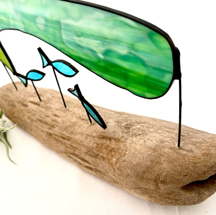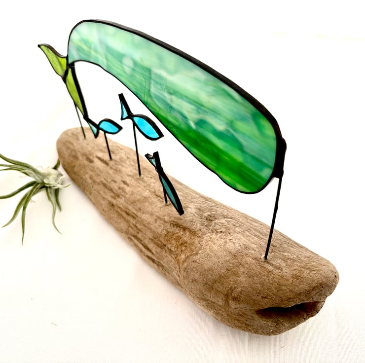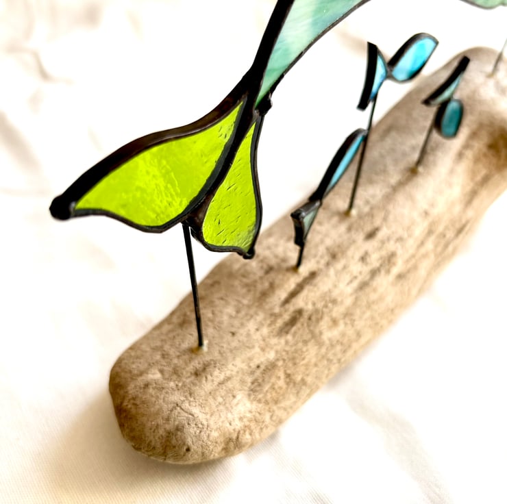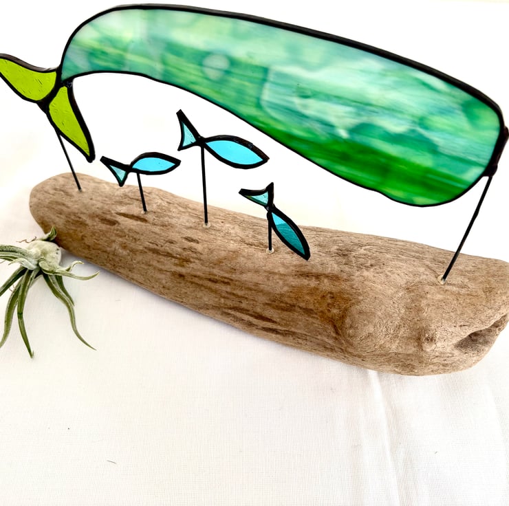 Handmade stained glass whale with a shoal of fish secured on a piece of driftwood collected on my walks on the Scottish shores.