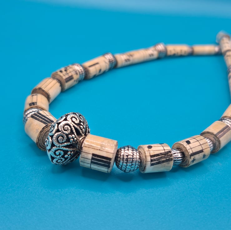 Working with recycled paper and turning it into a unique piece of jewellery is always joyous. But nothing is more satisfying than working with old music sheets, handrolling them into beads and pairing them with preloved beads. . I chose specific preloved beads with antique silver effects to give a tribal look to the necklace.