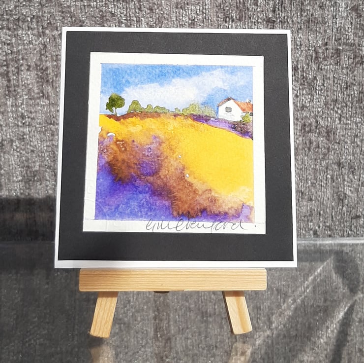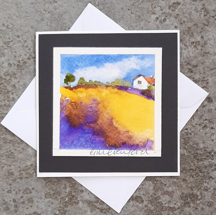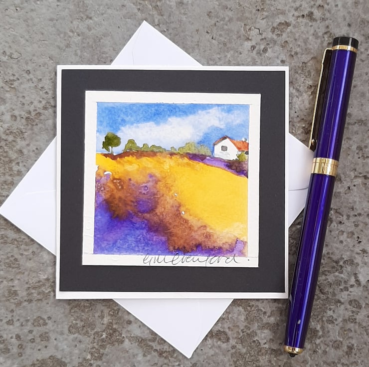 Beautiful watercolour painting made into a card of a farm cottage and fields.