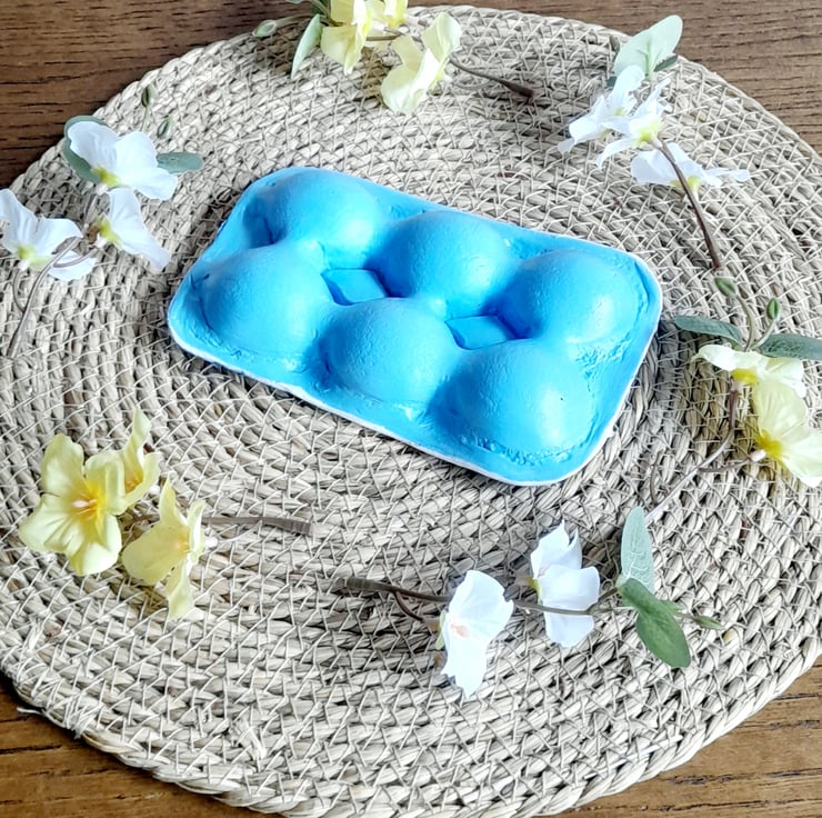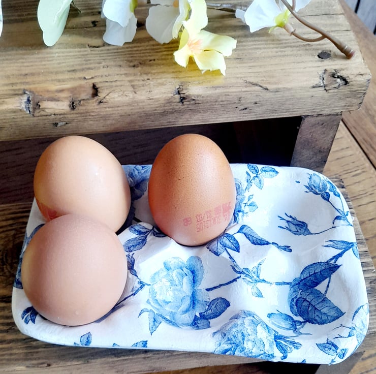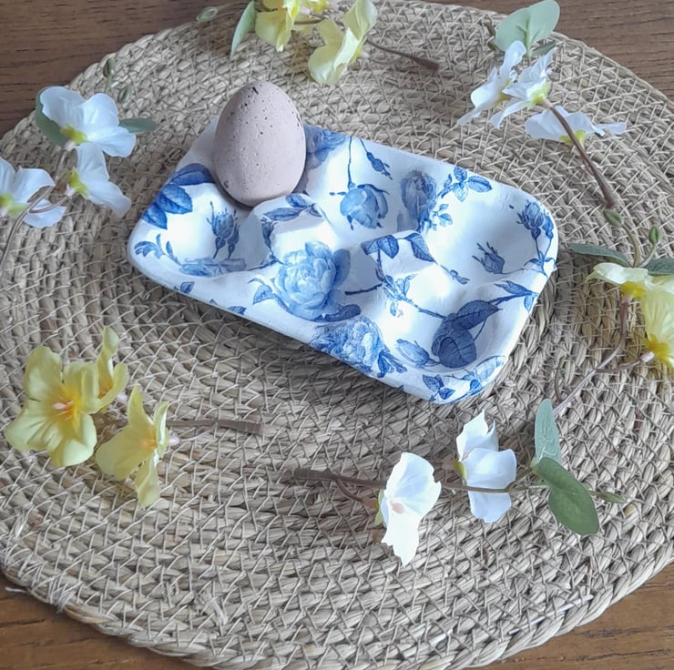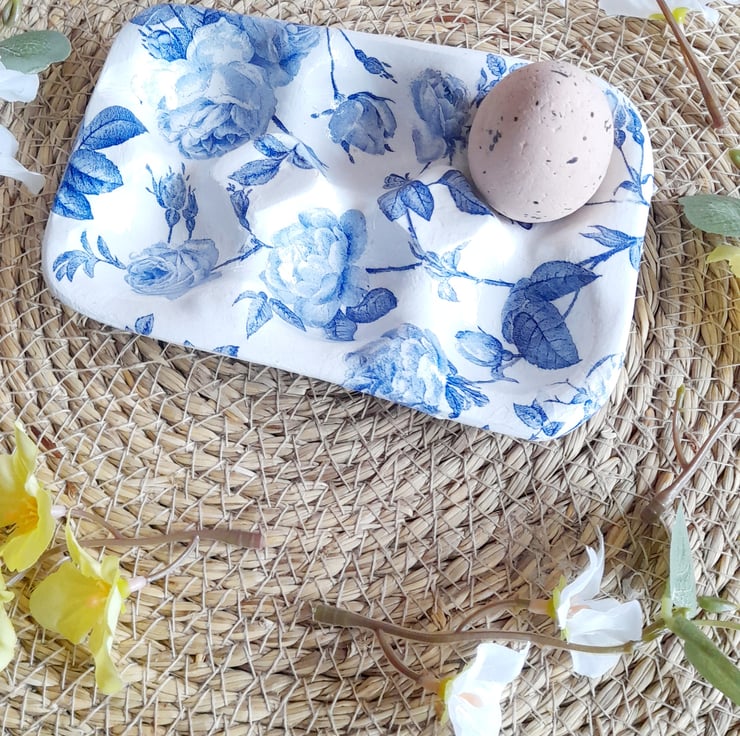 Handmade using Air Dry Clay & decoupaged in pretty blue roses is this unique, bespoke 6 egg holder.
