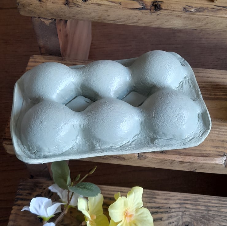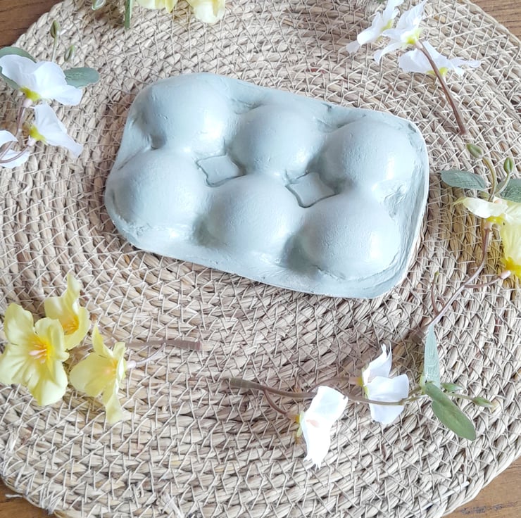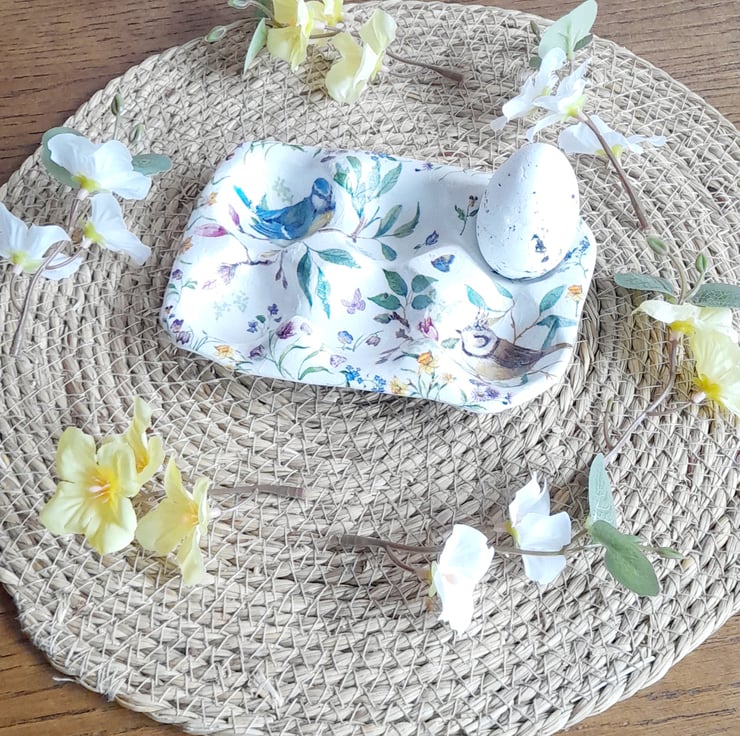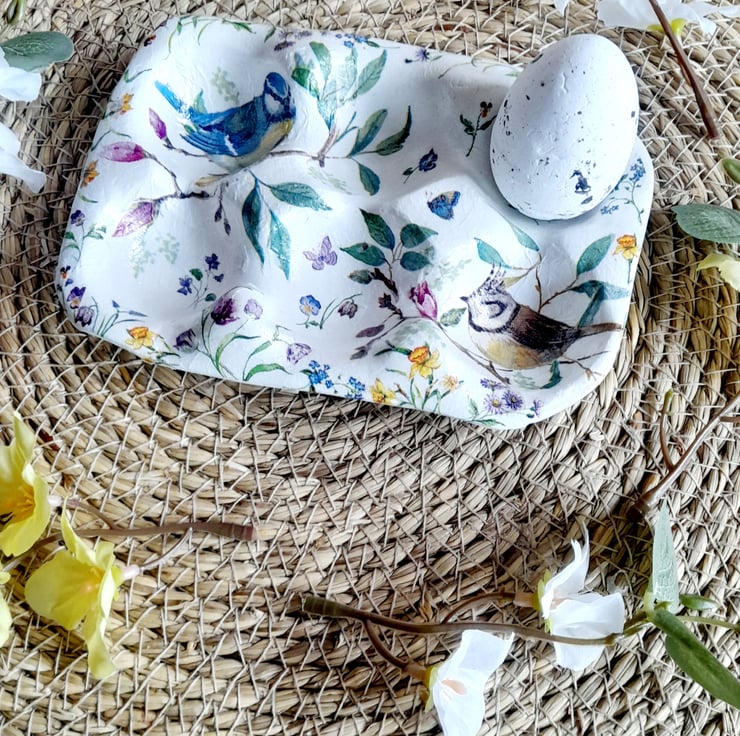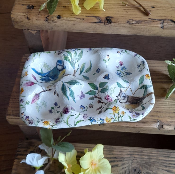 Handmade using Air Dry Clay & decoupaged in pretty florals & birds this unique, bespoke 6 egg holder.