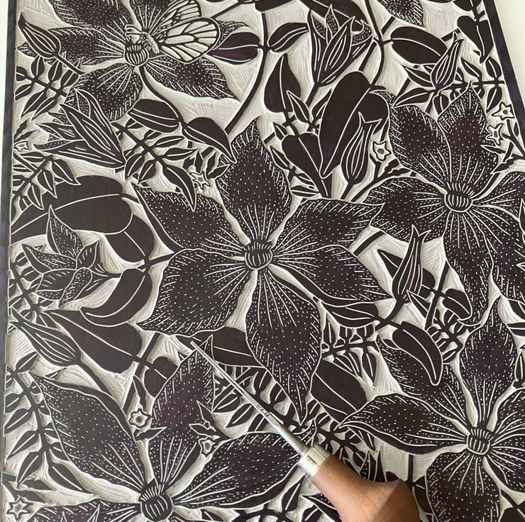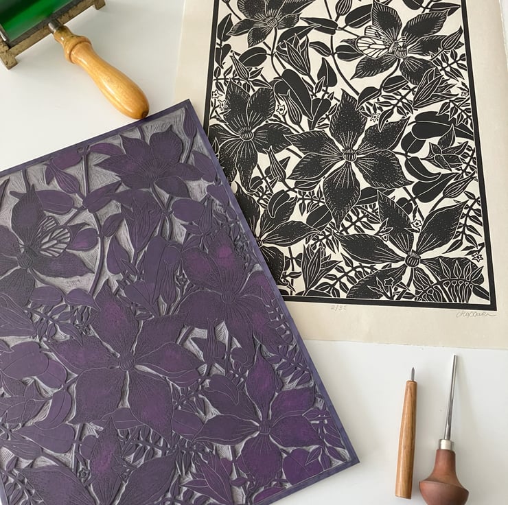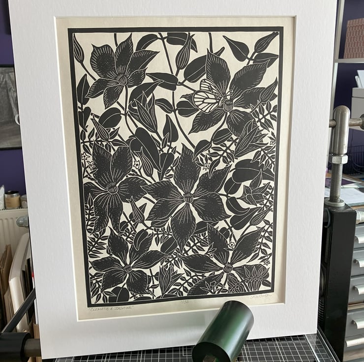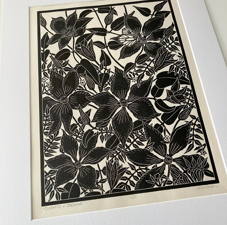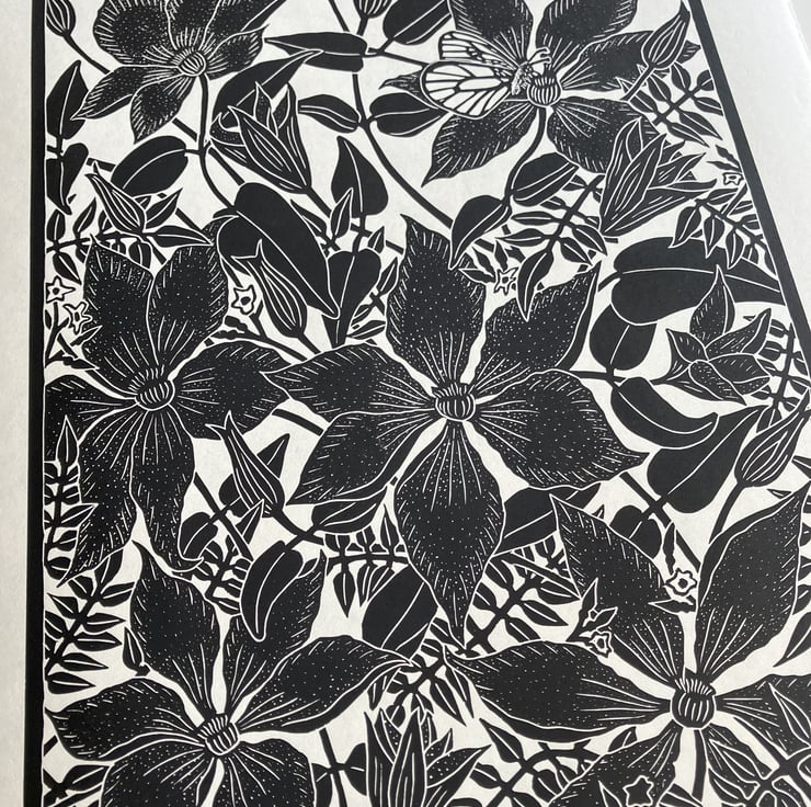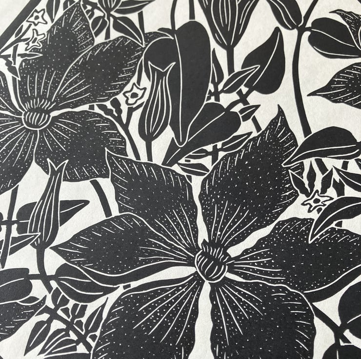 "Clematis & Jasmine" is a limited edition print created using the relief printmaking method of linocut printing. As each print is created by hand there may be tiny variations which add to the individual beauty of each original artwork. "Clematis & Jasmine" is printed onto Okawara 70gsm printmaking paper from Awagami Factory in Japan.