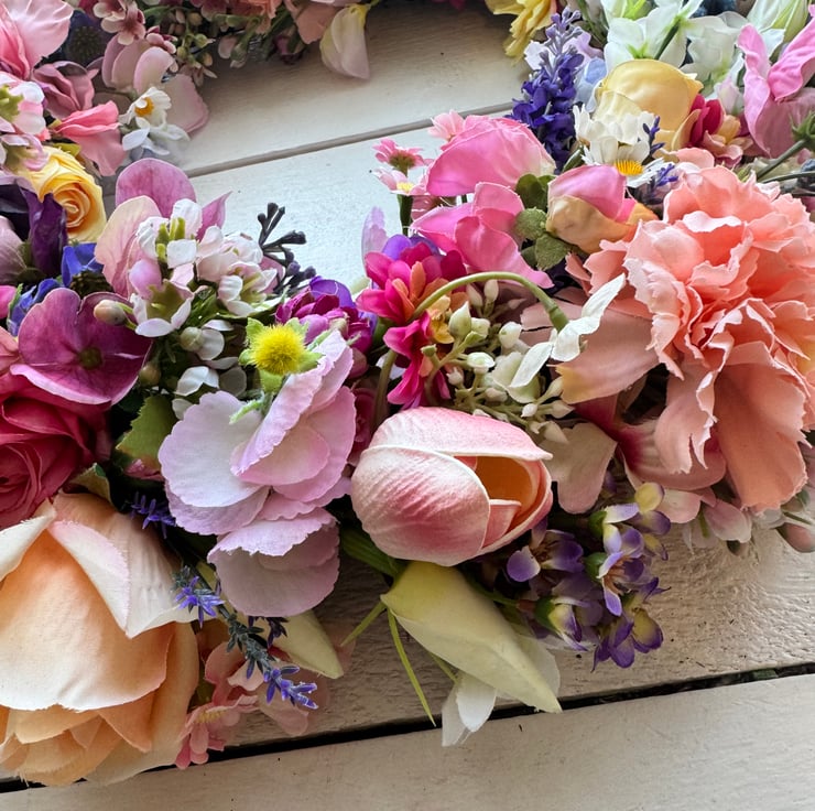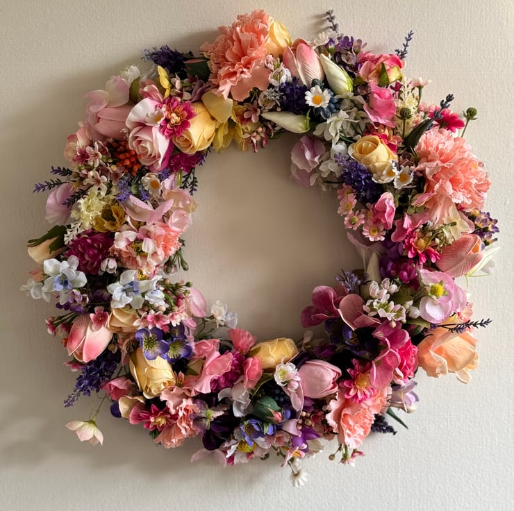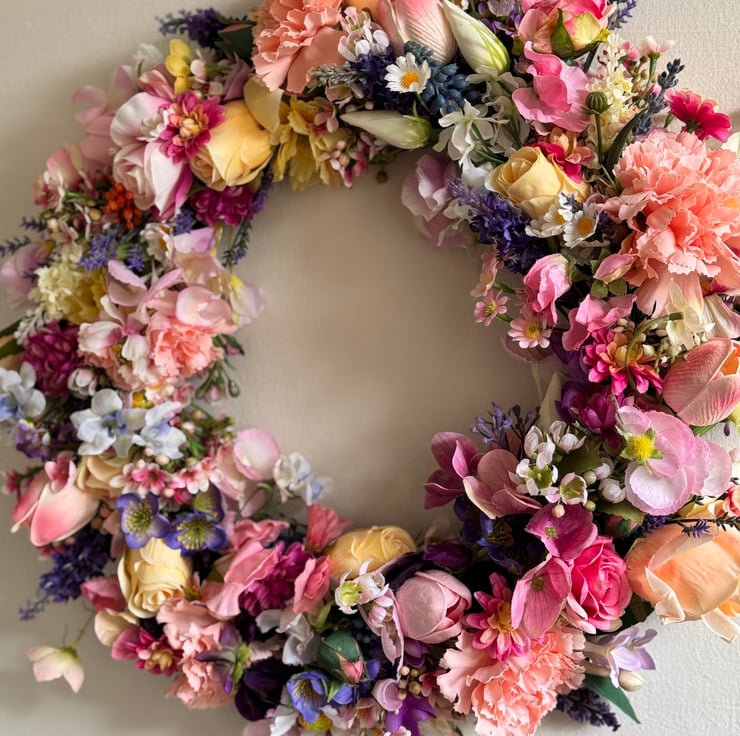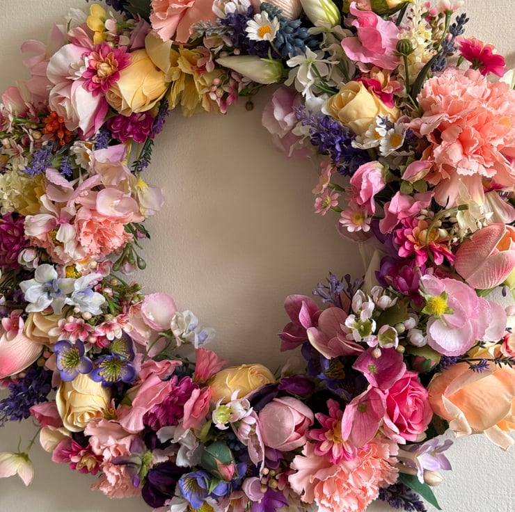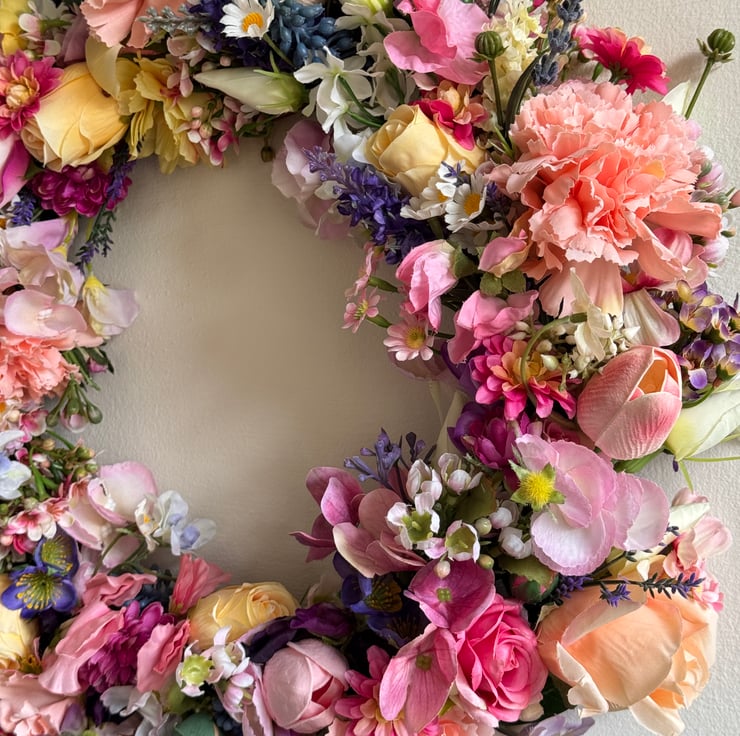 A full faux floral wreath set on a vine base, measuring 47cm.