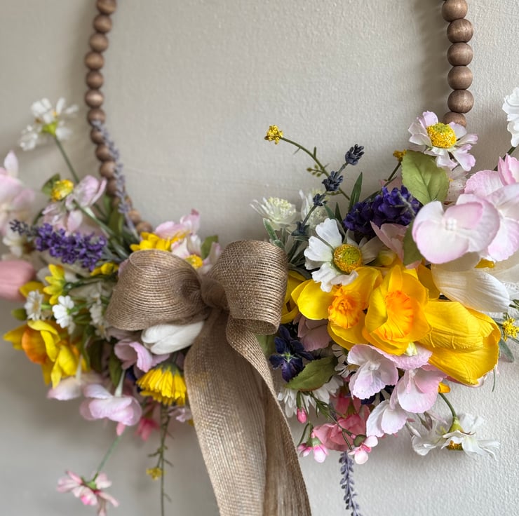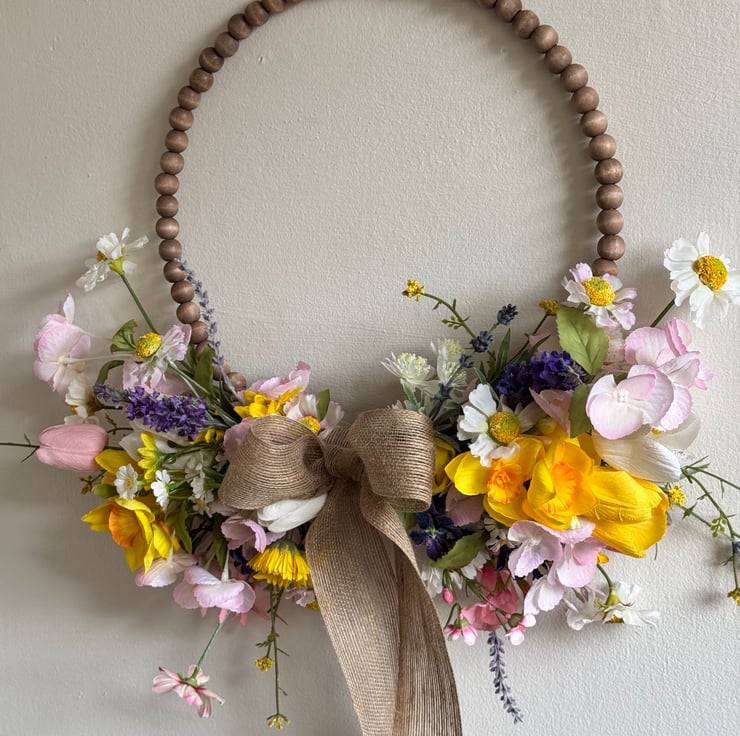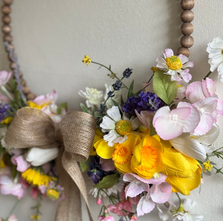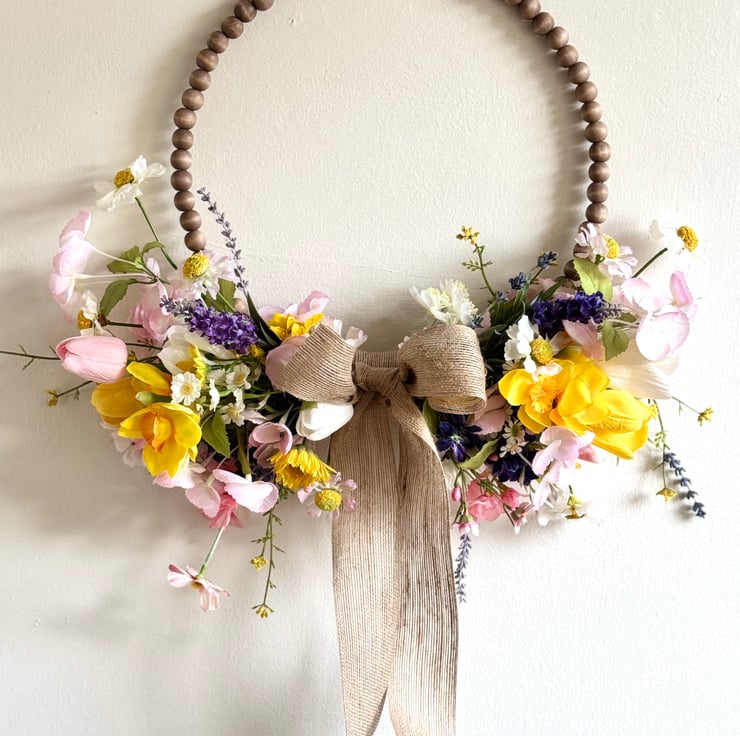 A half wreath set on a wooden beaded hoop using Spring faux flowers and finished with a burlap hoop.