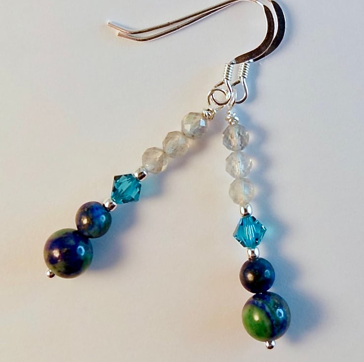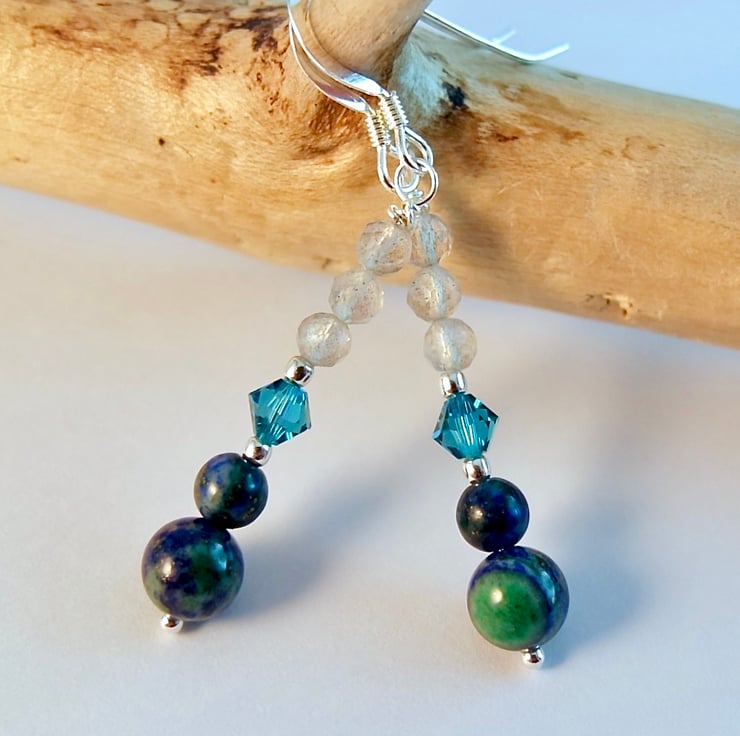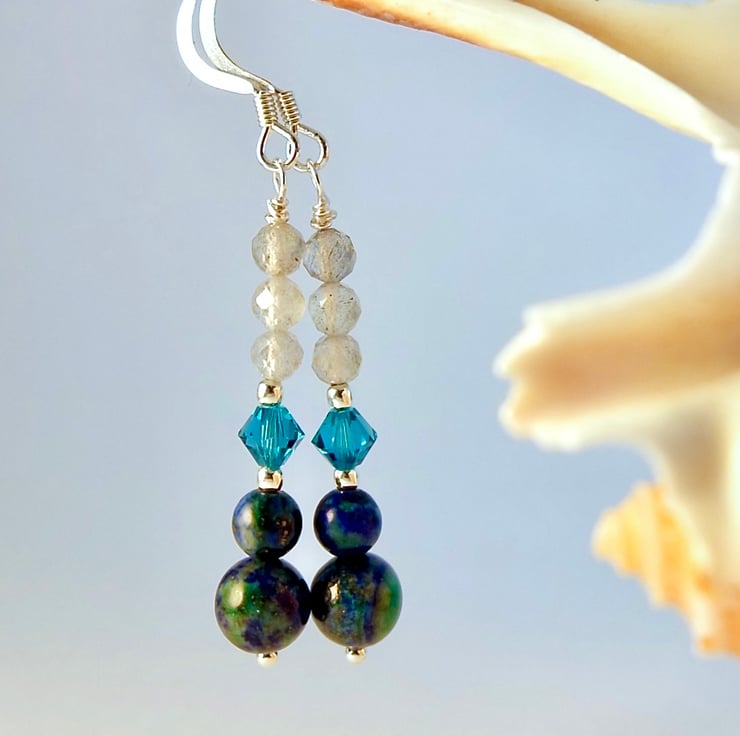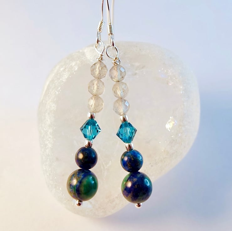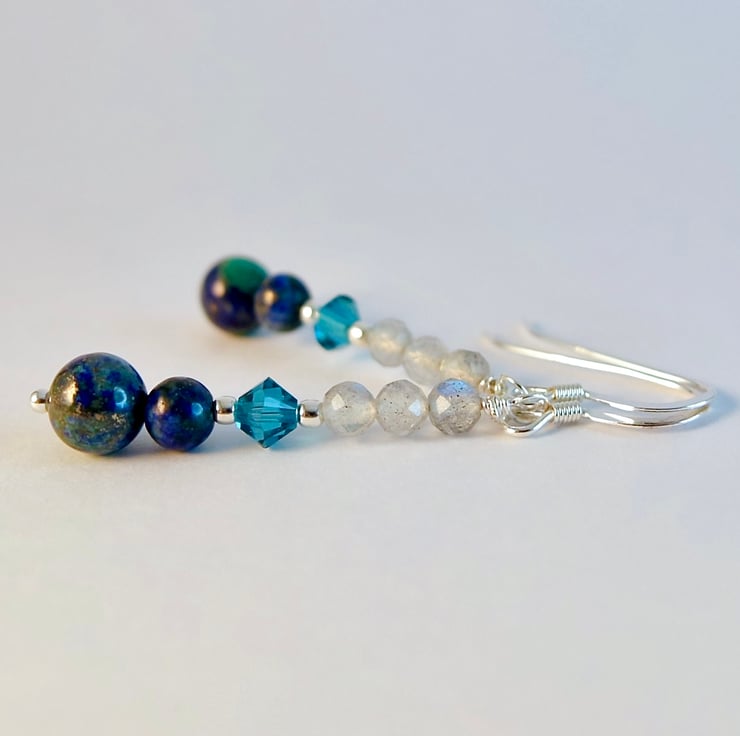 Each drop earring features a deep blue-and-green 6mm and 4mm chrysocolla bead topped with a sparkly Austrian 4mm crystal bicone in the colour 'indicolite and a trio of faceted AAA grade Labradorite beads.