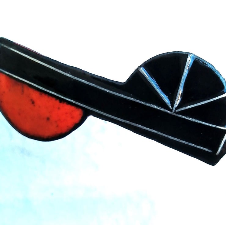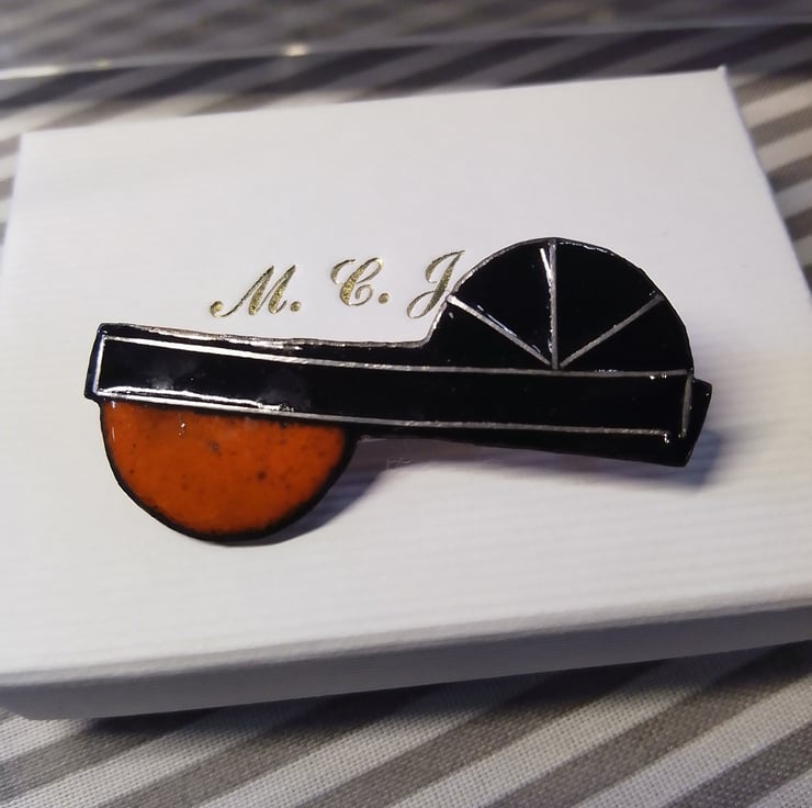 This stylish Art-Deco styled brooch is made from copper, kiln-fired enamels, with sterling silver embellishments. Simple and understated, it measures 50mm in length and approx. 22mm at it's widest point. Gorgeous!