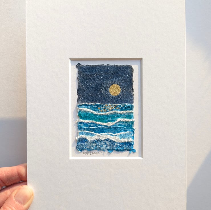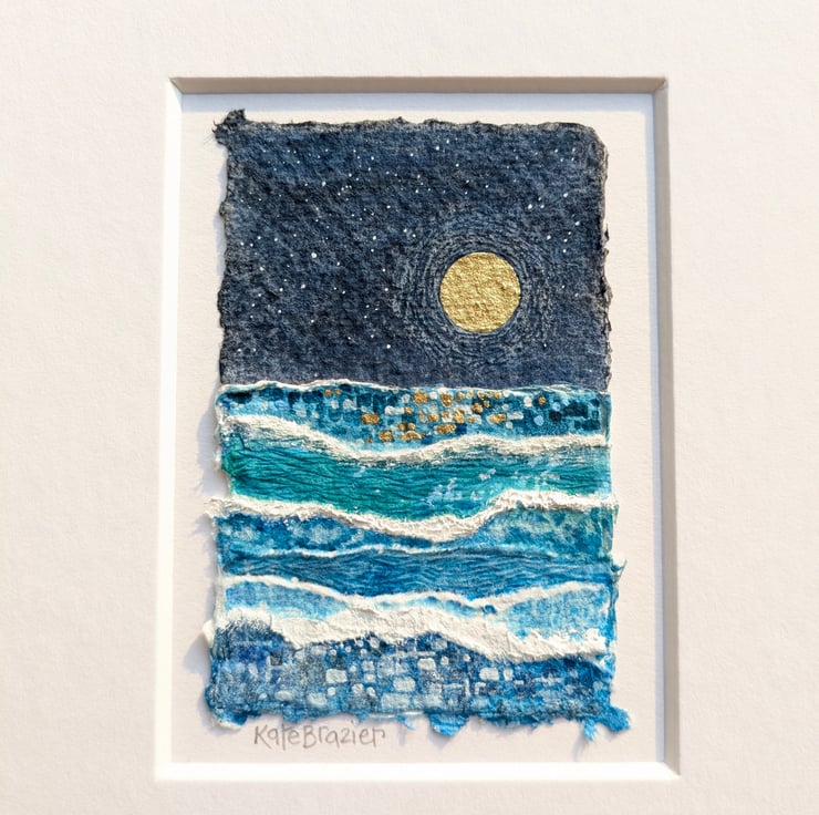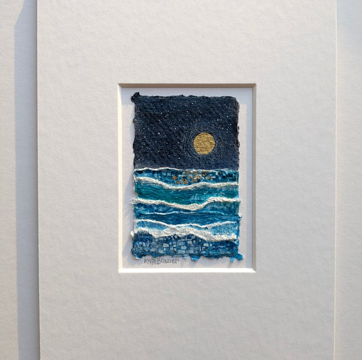 'Under a Golden Moon' is a tiny, mixed media collage float mounted into a custom A5 mount.