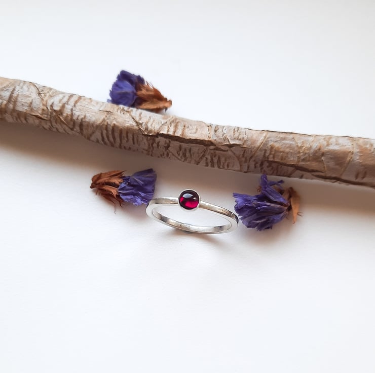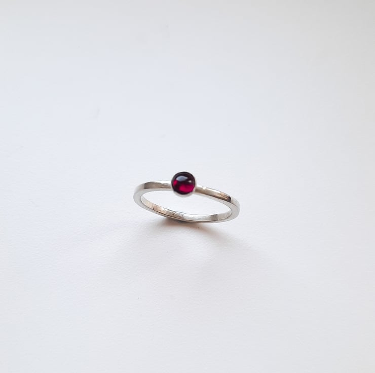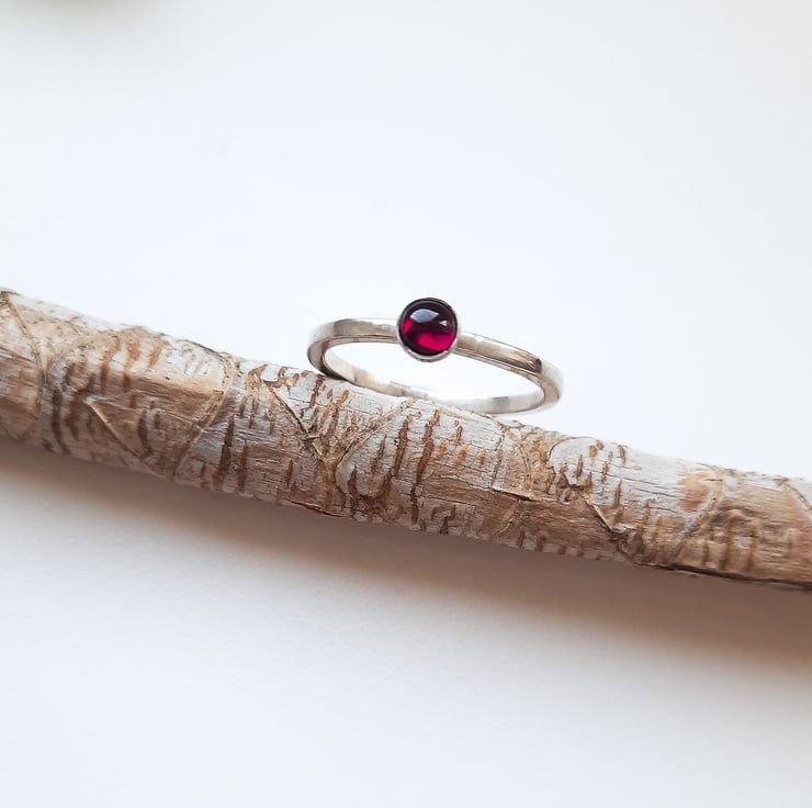 A sterling silver ring band of 1.5mm width with a 4mm round garnet cabochon. I would advise against immersing the ring in water as this could loosen the stone.