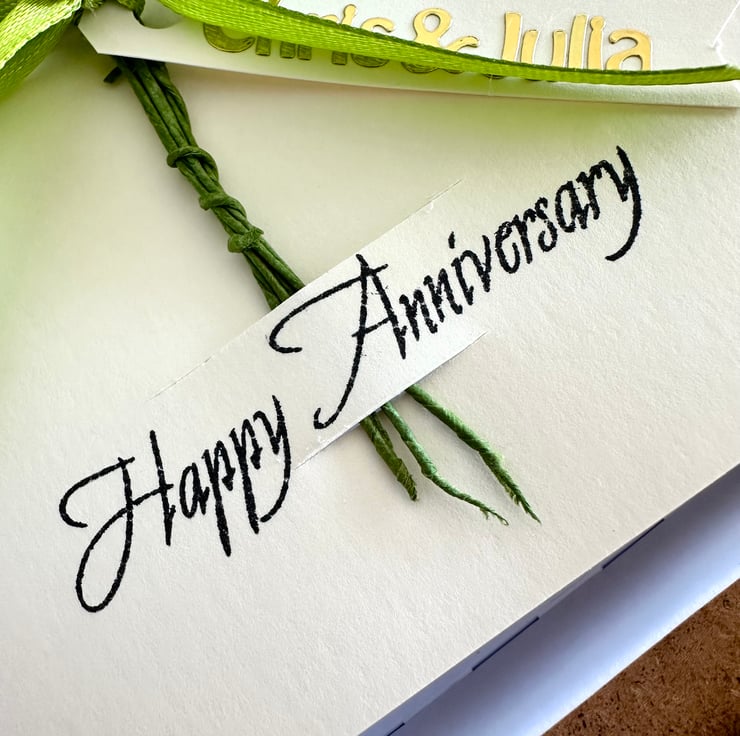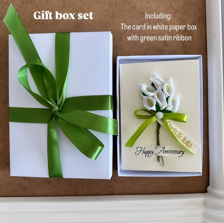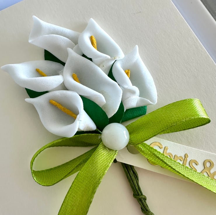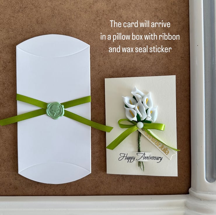Celebrate a special milestone with this handmade anniversary card featuring a charming floral bouquet, accented with white calla lilies and tied together with a vibrant moss green ribbon.