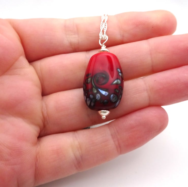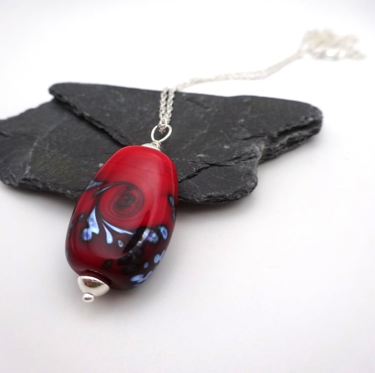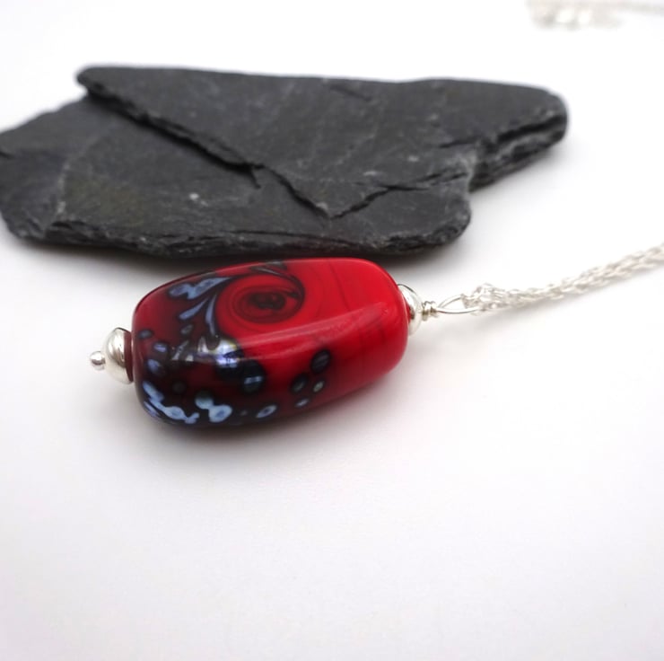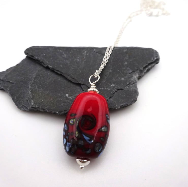 A sterling silver chain which features a handmade lampwork glass red glass pendant. The pendant has been decorated with silver speckles.