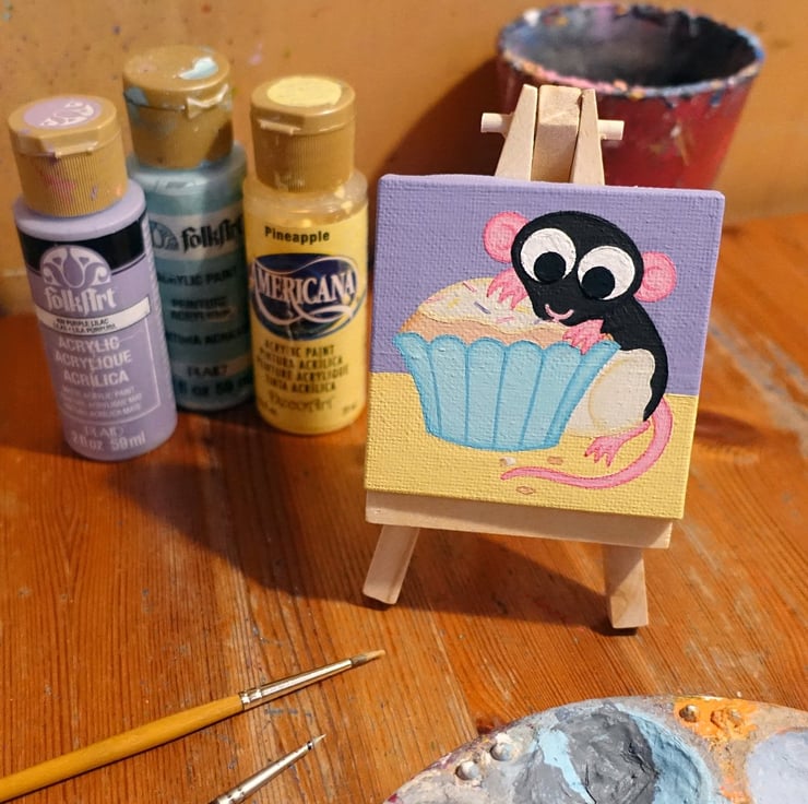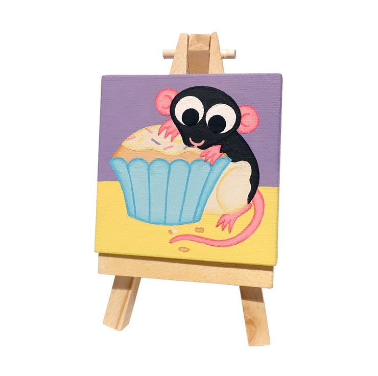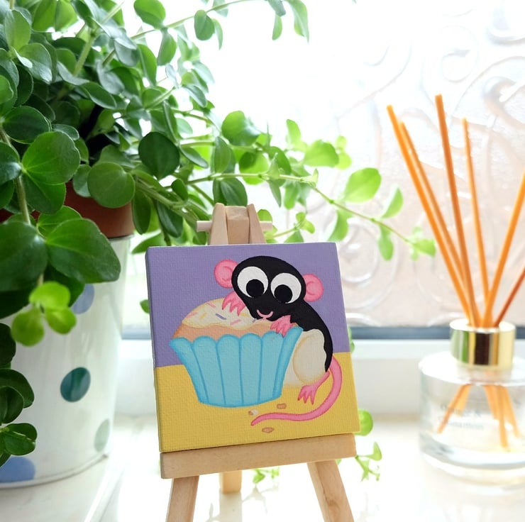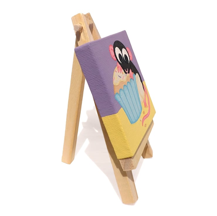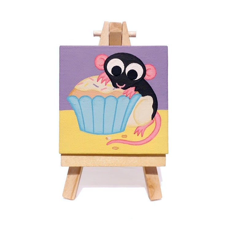 Rat with Cupcake Miniature Painting - cute acrylic art, rat lover birthday gift