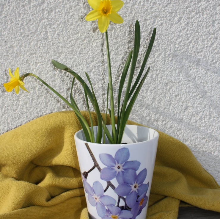 I love the humble forget me not, it provides a splash of vivid colour in the springtime. These flowers were photographed in my own garden, I zoomed in to really appreciated the pretty detail. I printed the image onto transfer paper, cut the design out by hand and then transferred it to the ceramic pot using sublimation.