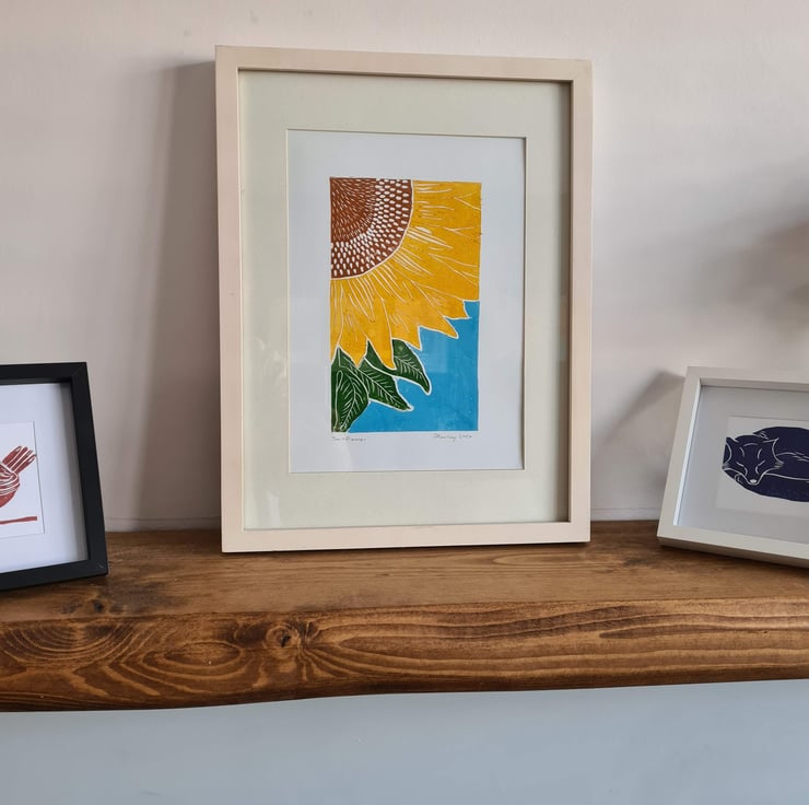 I have individually handprinted this sunflower print from my own linocut design. It is a 'jigsaw print'. To do this I carved the whole design, then cut the lino into pieces according to colour, so each colour block can then be inked individually before printing the whole picture. This process takes more time to print but also enables me to print unlimited amounts of the design and also to print in different colours if desired.