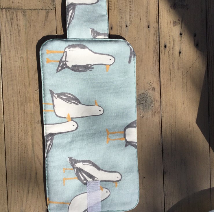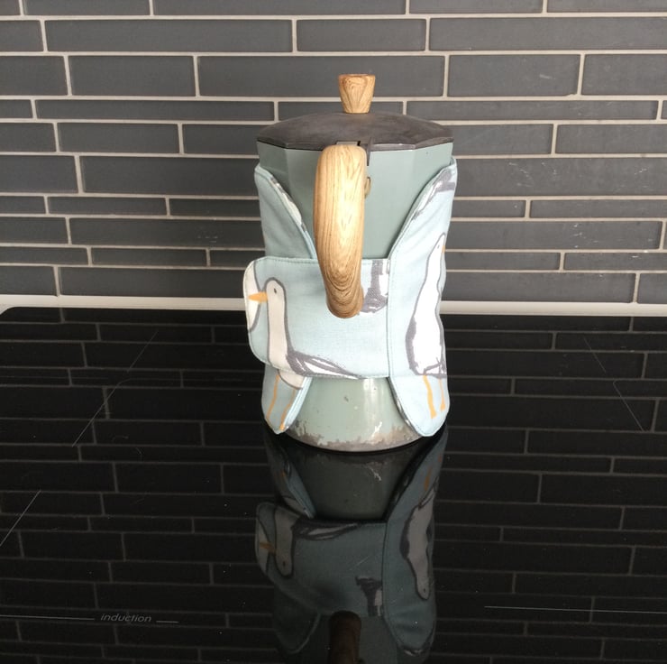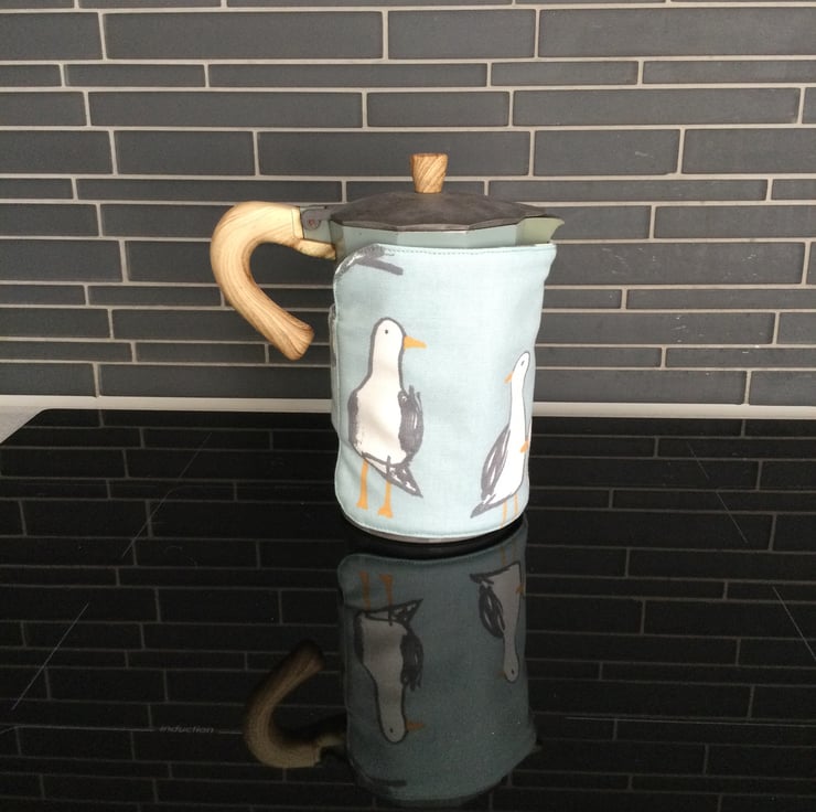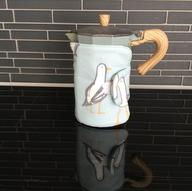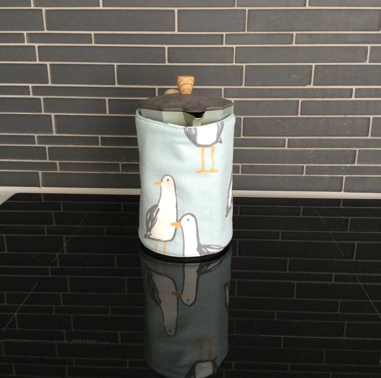 Keep your coffee pot hot with this cute cafetiere cover. I love this delightful seagull print, with cute seagulls on a pale blue/green background. A double layer of fleece to keep your coffee warm. Wrap it round your coffee pot and fasten with the hook and loop tabs.