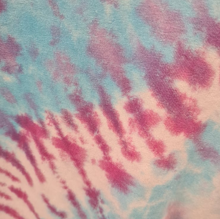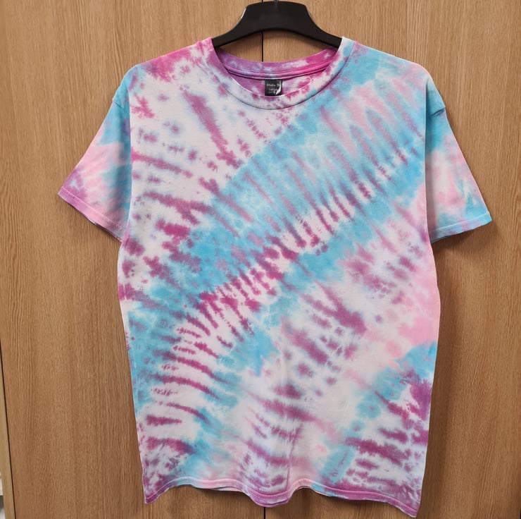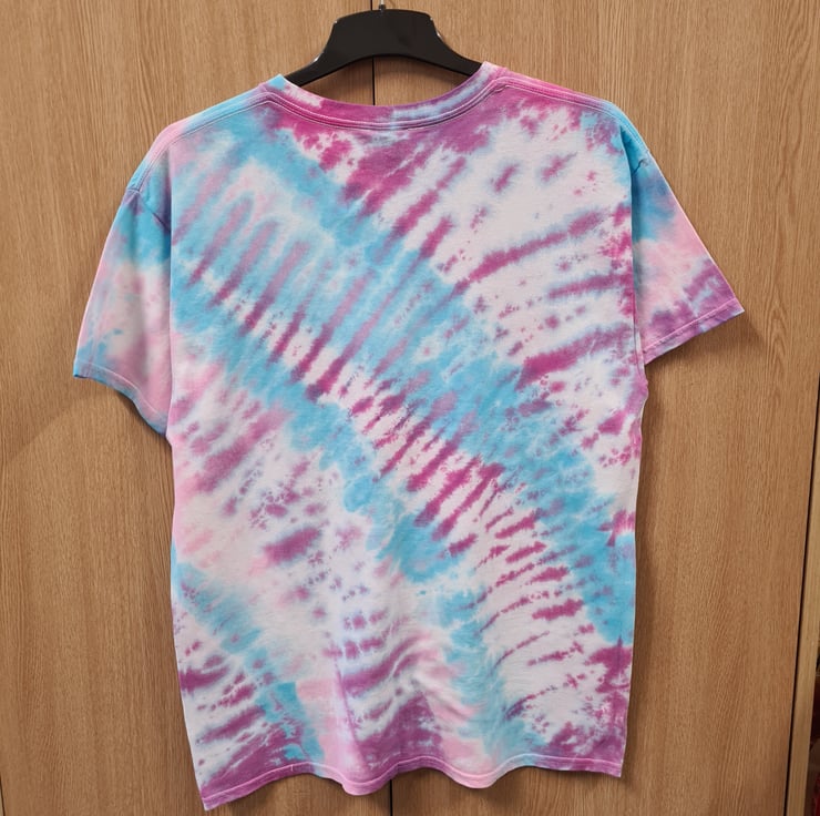 A unisex t-shirt dyed in pastel shades of pink and turquoise. Size large, chest measures 55cm pit to pit