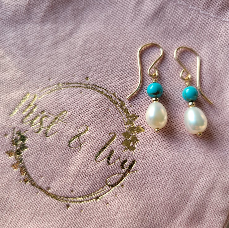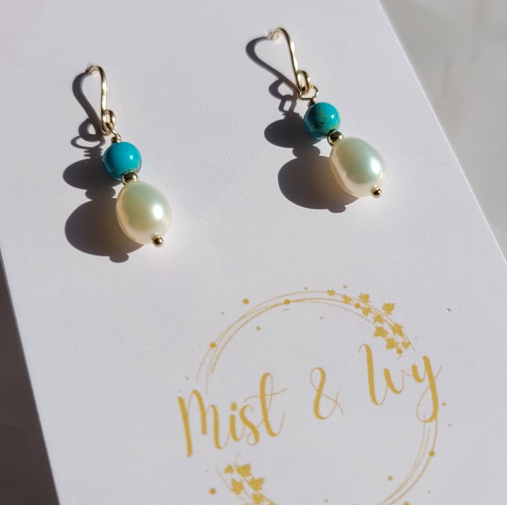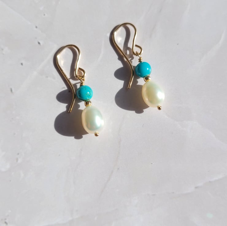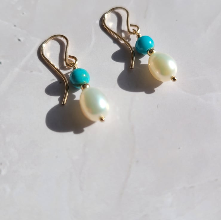 These beautiful, timeless earrings are made with freshwater pearls, turquoise beads and gold filled beads that have been wire wrapped onto 14kt gold filled earring hooks. The earrings are 2.8mm in length.