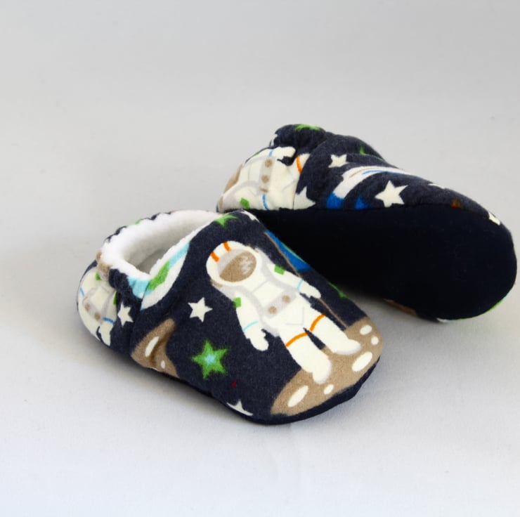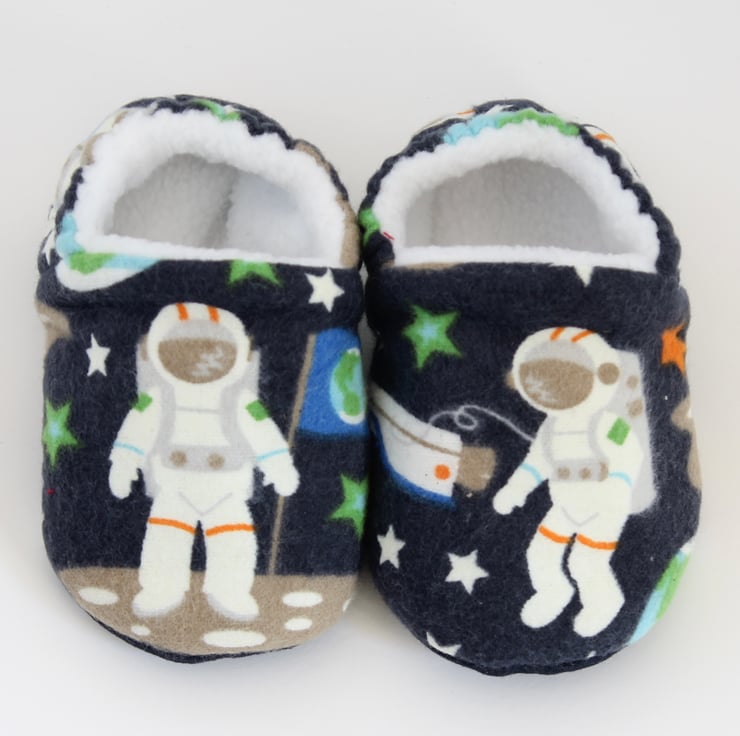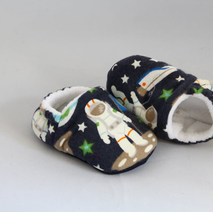 The outer shoe are made from a brushed cotton and the little spacemen glow in the dark. The lining is a soft white fleece and the sole is a navy cotton.