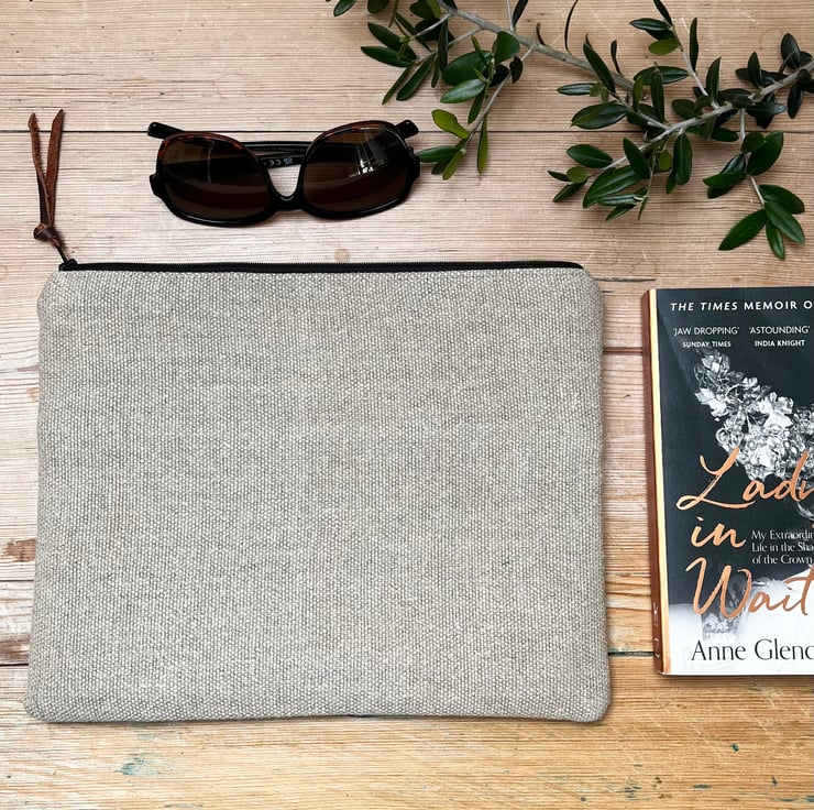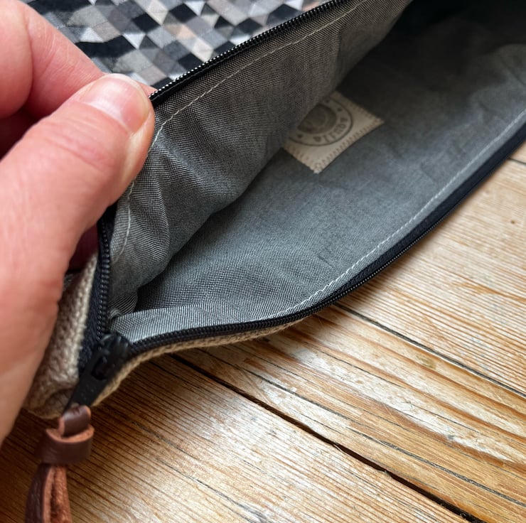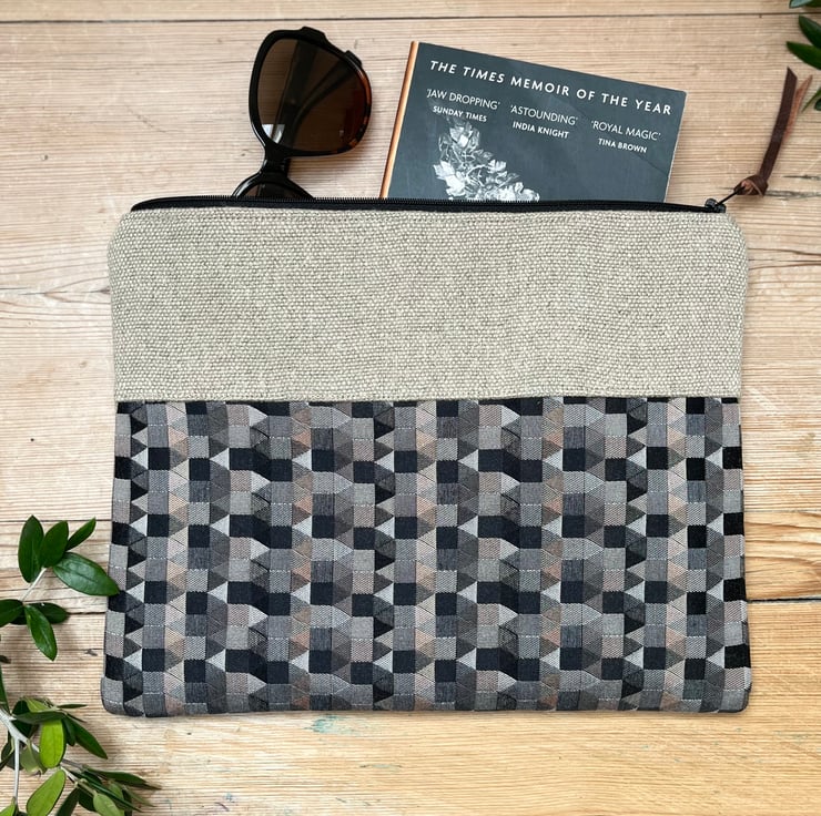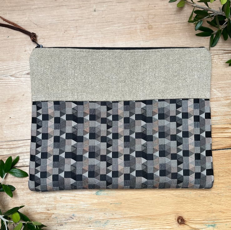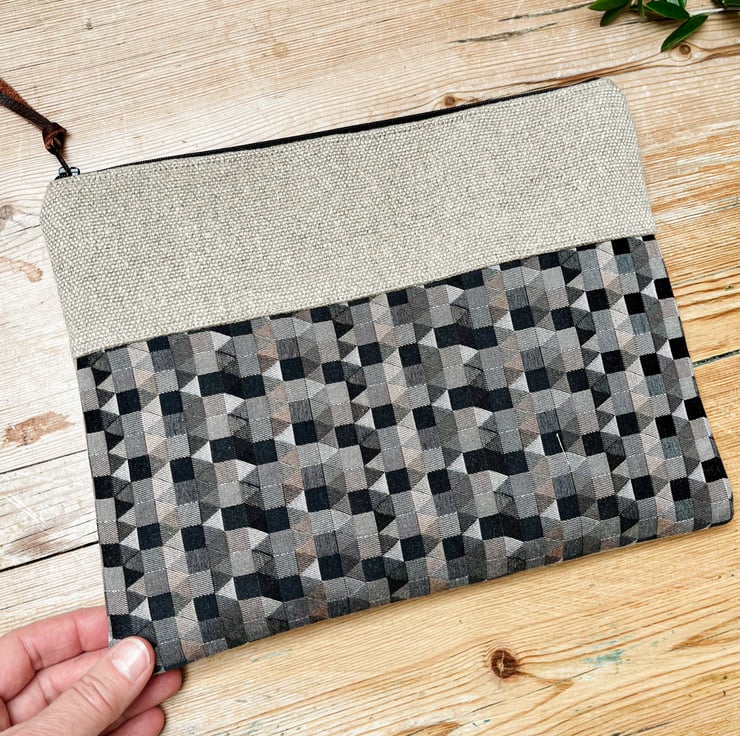 One of a kind large zip pouch made from a sample swatch of geometric woven fabric in shades of grey and thick natural linen. The pouch is fully lined in dark grey fabric. A layer of interfacing gives the pouch a soft structure.