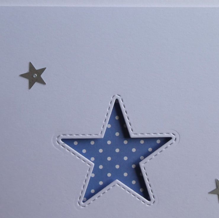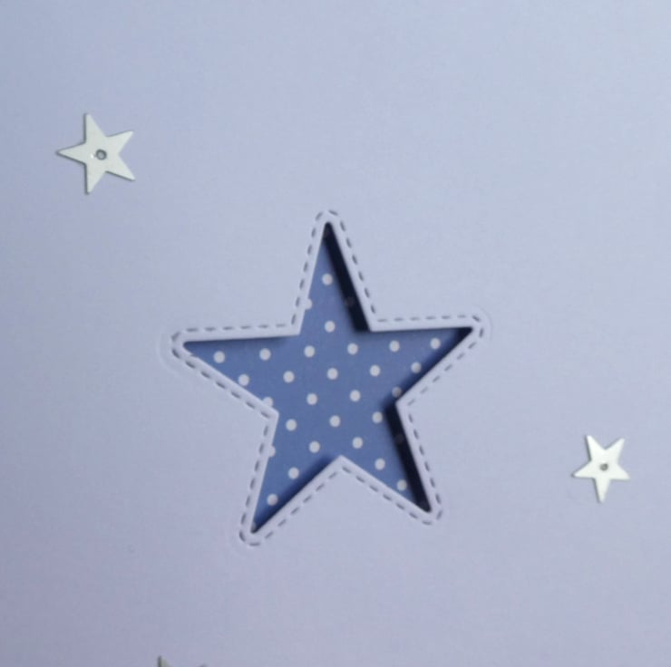 The card has a dark blue and white polka dot background which can be seen through a star shaped aperture.