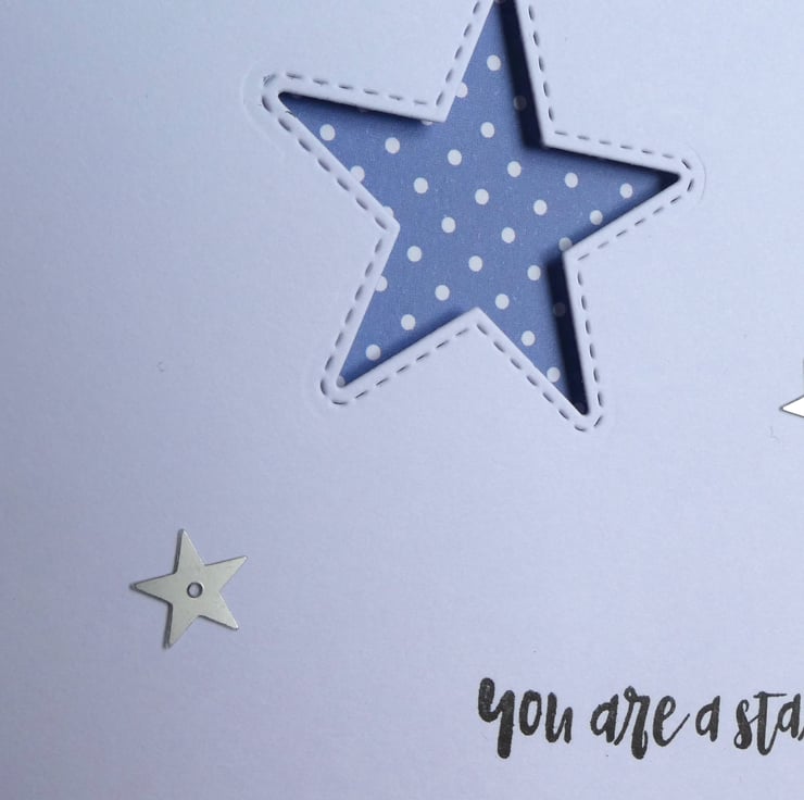 The card has been hand stamped with the greeting You Are A Star in black archival ink and the design has been completed with 3 silver star shaped sequins.