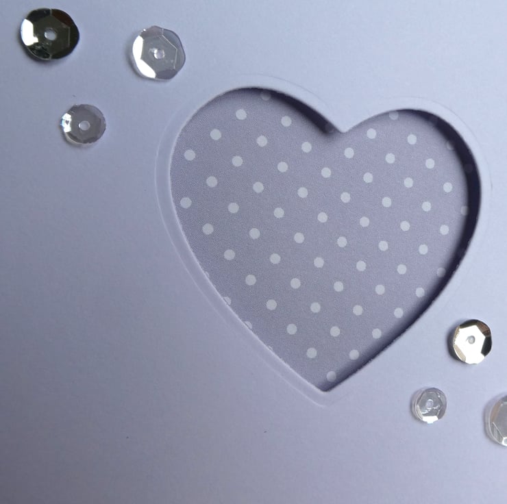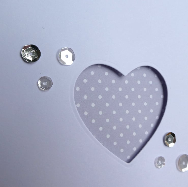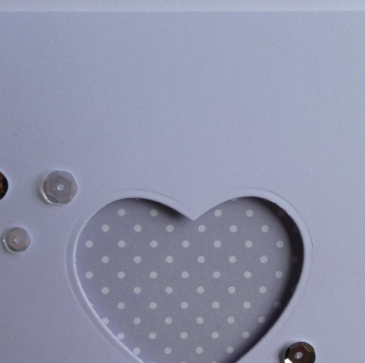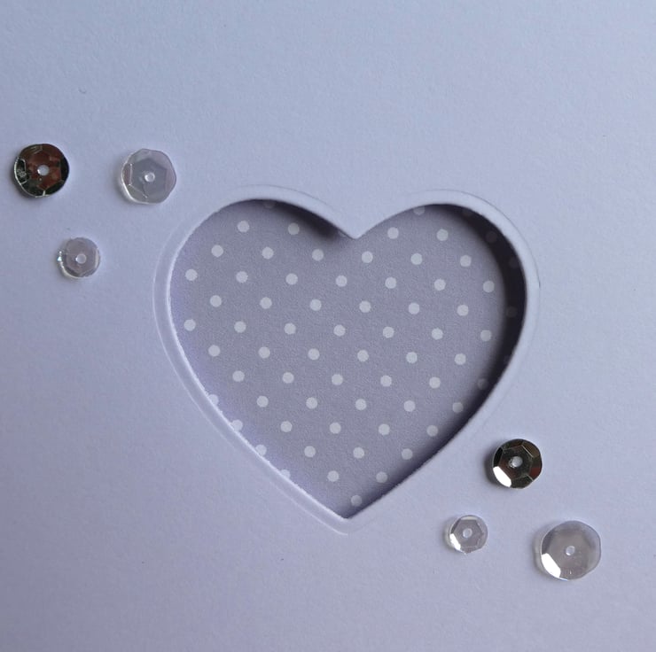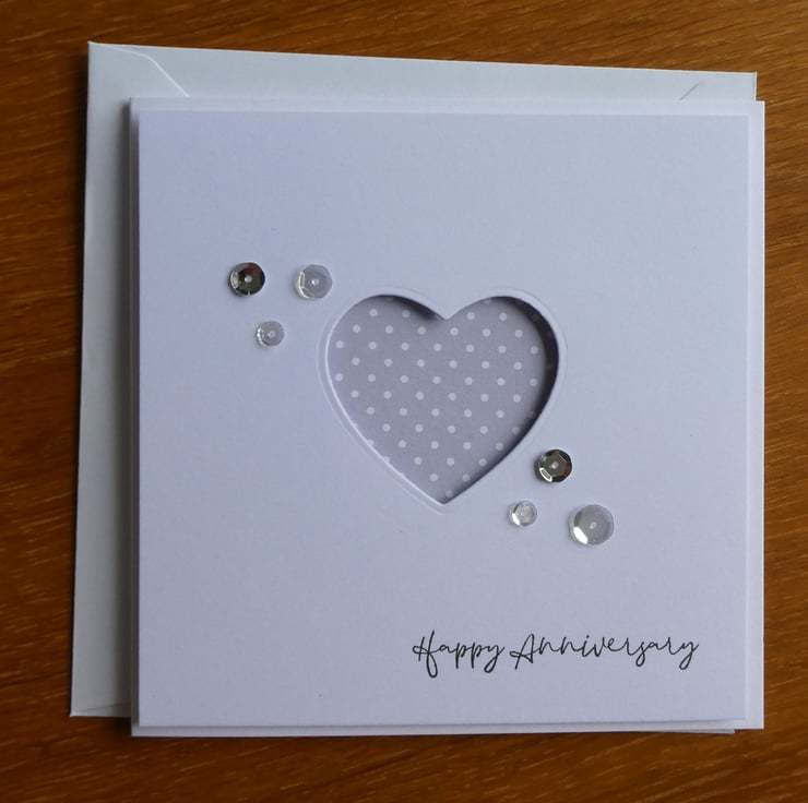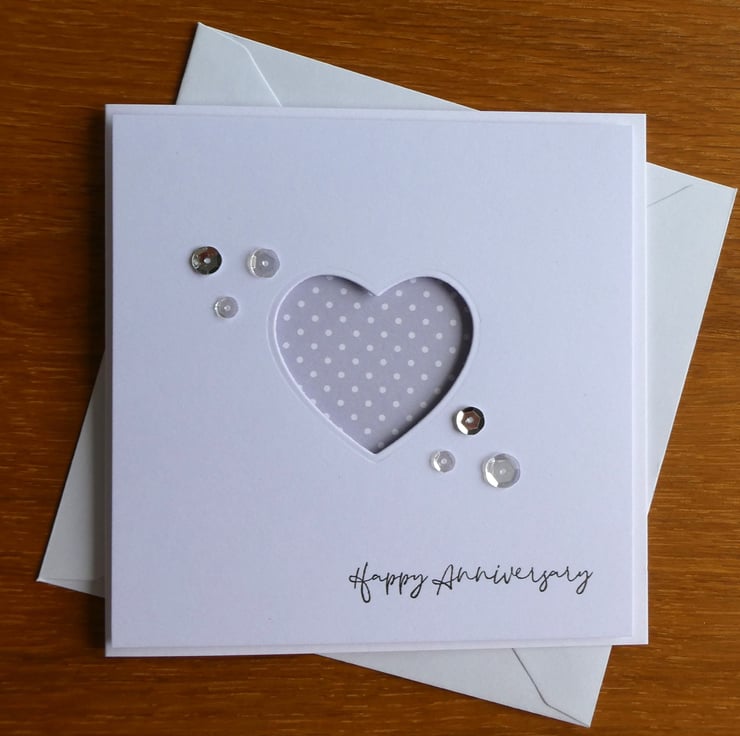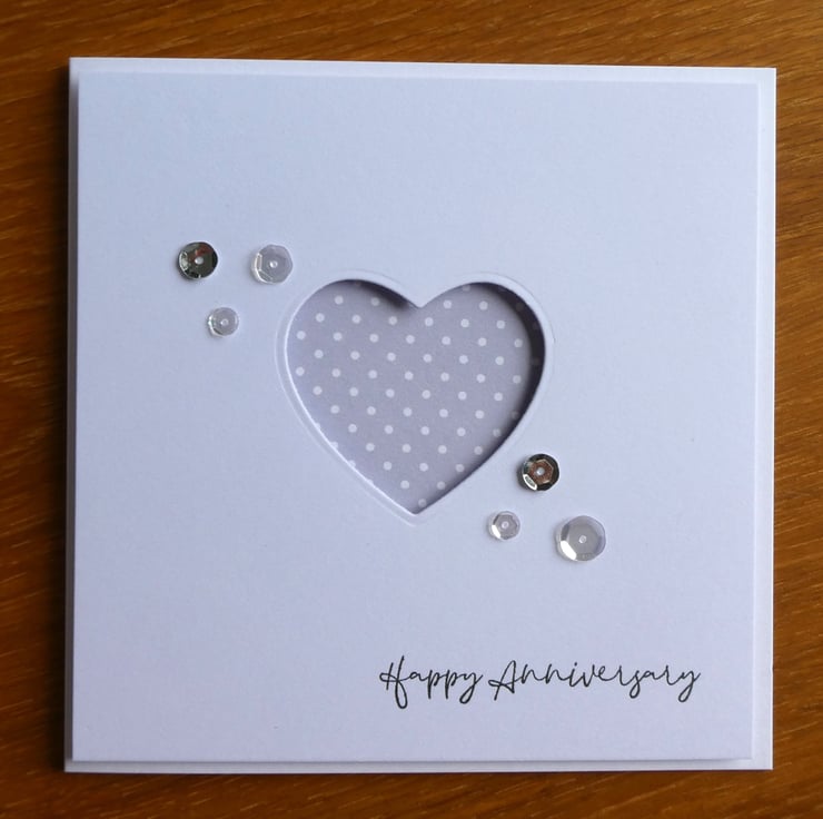 This simple and elegant anniversary card has a grey and white polka dot background which can be seen through a heart shaped aperture. The colour scheme means it could be sent for a silver or platinum anniversary but would also be suitable for any anniversay.