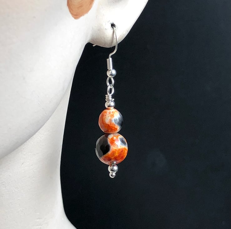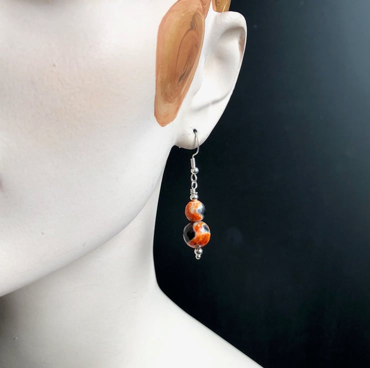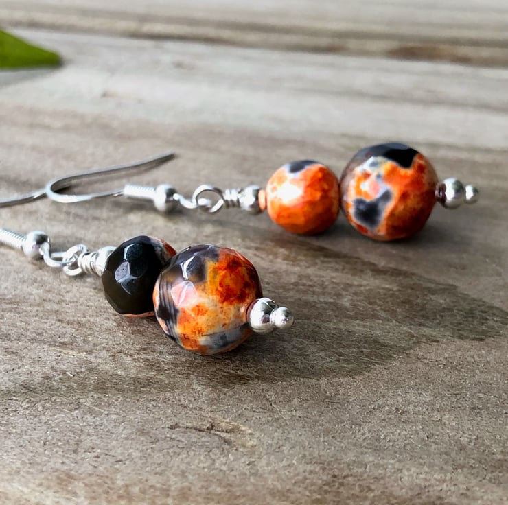 Lovely little lightweight dangly drop earrings with orange and black 10mm and 8mm dragon's vein fire agate gemstone beads in a graduated teardrop shape.