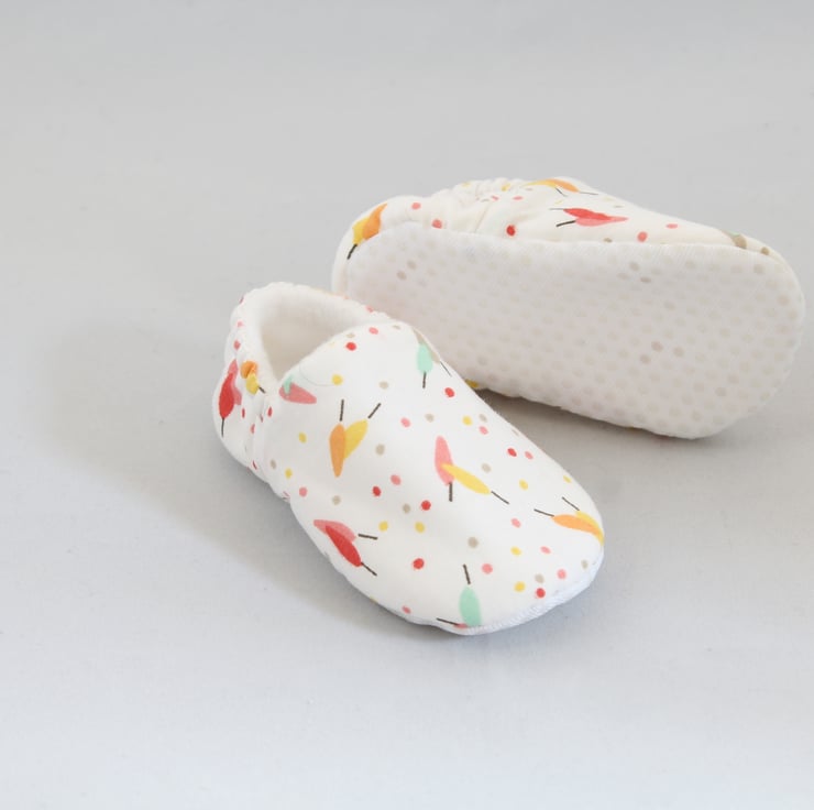 The outer upper is made from cotton, the inner is a soft lightweight fleece and the sole is anti slip.