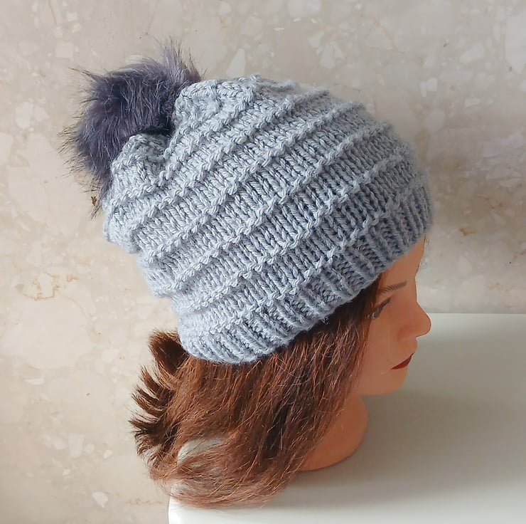 This listing is for a chunky beanie hat and features a pretty grey faux fur pom pom,