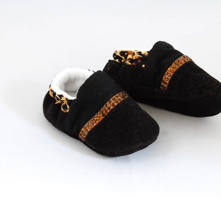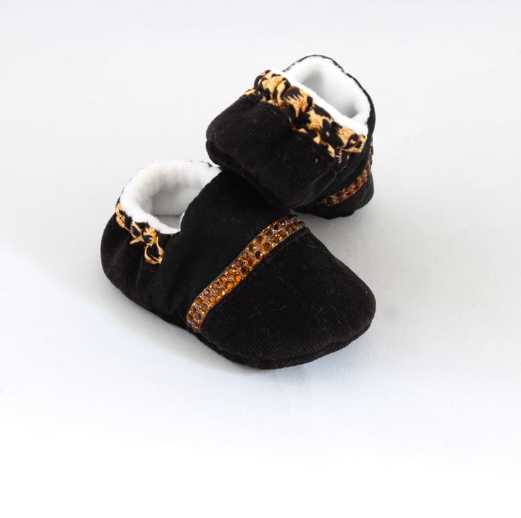 The upper shoe is made from cotton, with a cotton corduroy toe with a line of brown jewels, the sole is corduroy and the inner shoe has a soft white fleece.