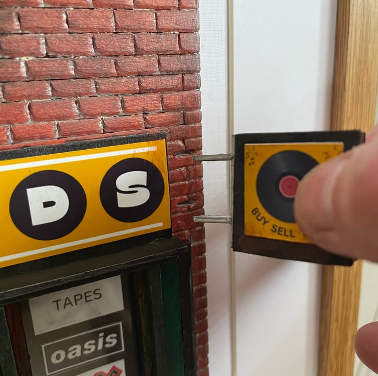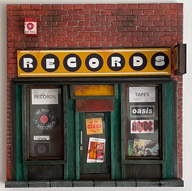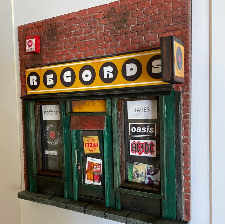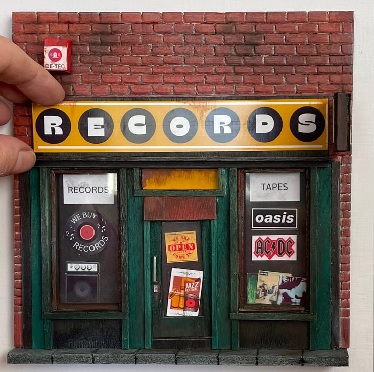 Step back in time with this handmade miniature diorama, beautifully capturing the charm of a vintage record store front. From the retro signage to the carefully detailed exterior, this piece is a perfect homage to classic vinyl culture.