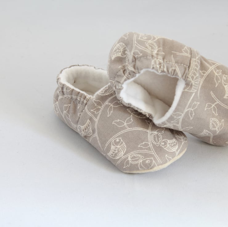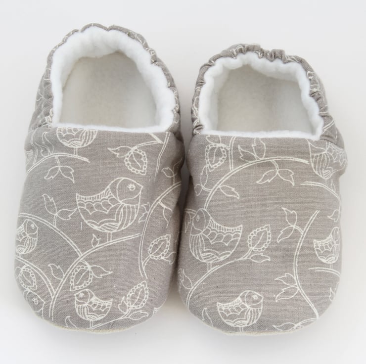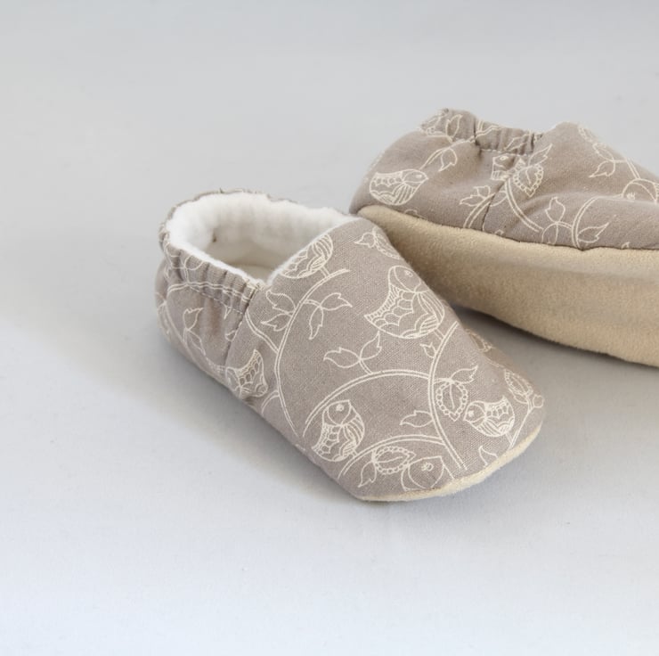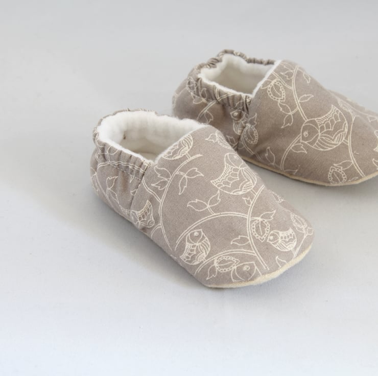 These little grey cotton shoes have been made to fit a 6-9 month baby (UK size 3) the length of the sole is 12CM,