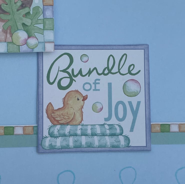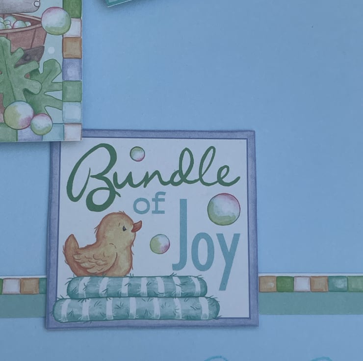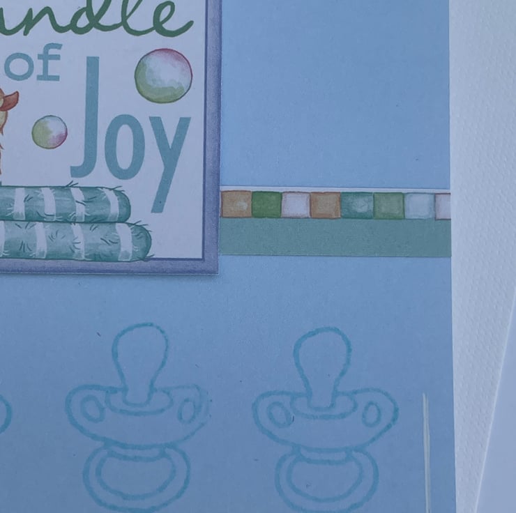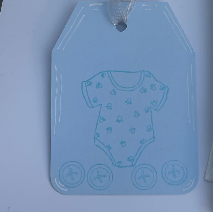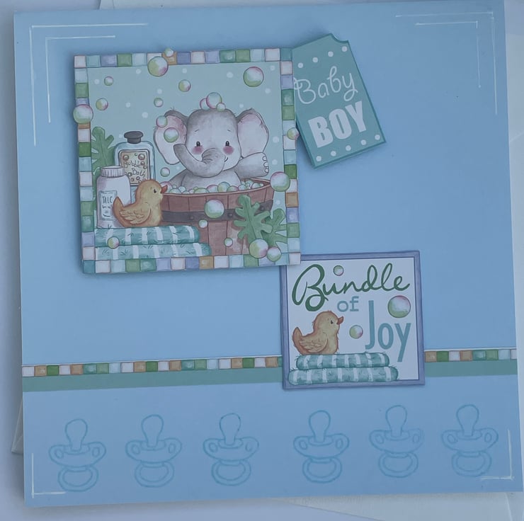 So very very cute! This 6cmx6cm card is in a lovely shade of blue. It is topped with a lovely image of a cute elephant in a bubble bath, he has his towels, rubber duck, bubble bath and talc at the ready. He is surrounded with lot od bubbles. The design is enhanced with a matching Bundle of Joy sentiment, again with a rubber duckie, and a Baby boy tag. A matching border strip lies above a section of dummies stamped to the bottom. A matching tag, in the same card, comes with the card, it features a stamped baby vest and buttons. A beautiful set to send to the parents of that brand new baby boy.