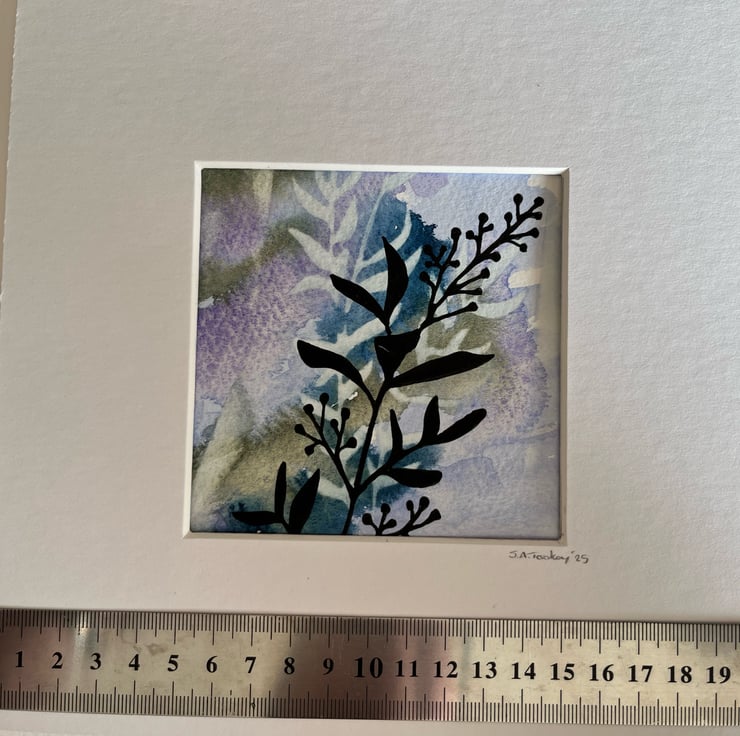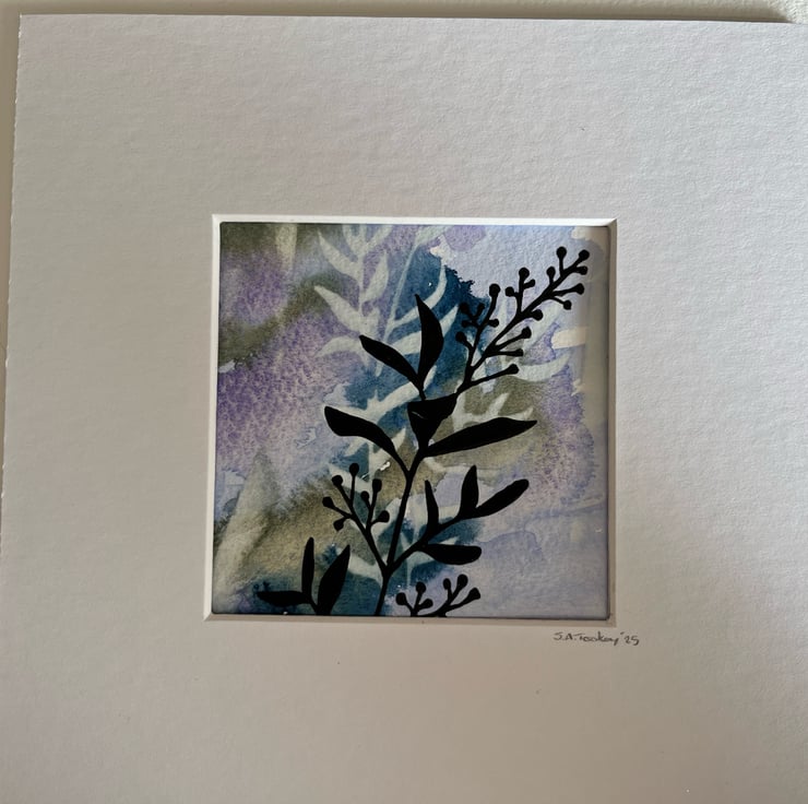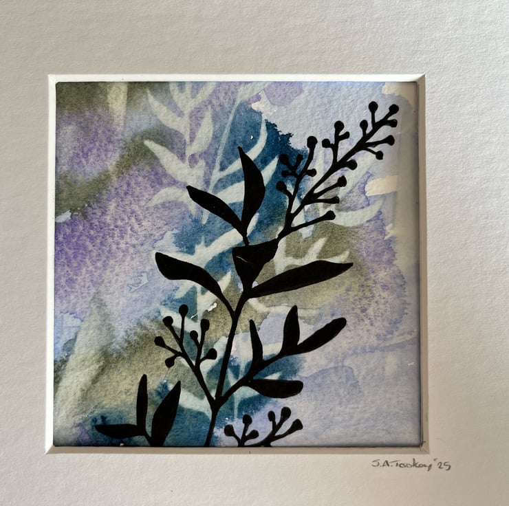 A watercolour and ink painting using reverse stencilling for depth and texture along with beautiful granulating watercolour and hand painted ink flowers. Using the best quality Bockford cotton watercolour paper and mounted in a beautiful deep mount to set off the painting to it’s best advantage.