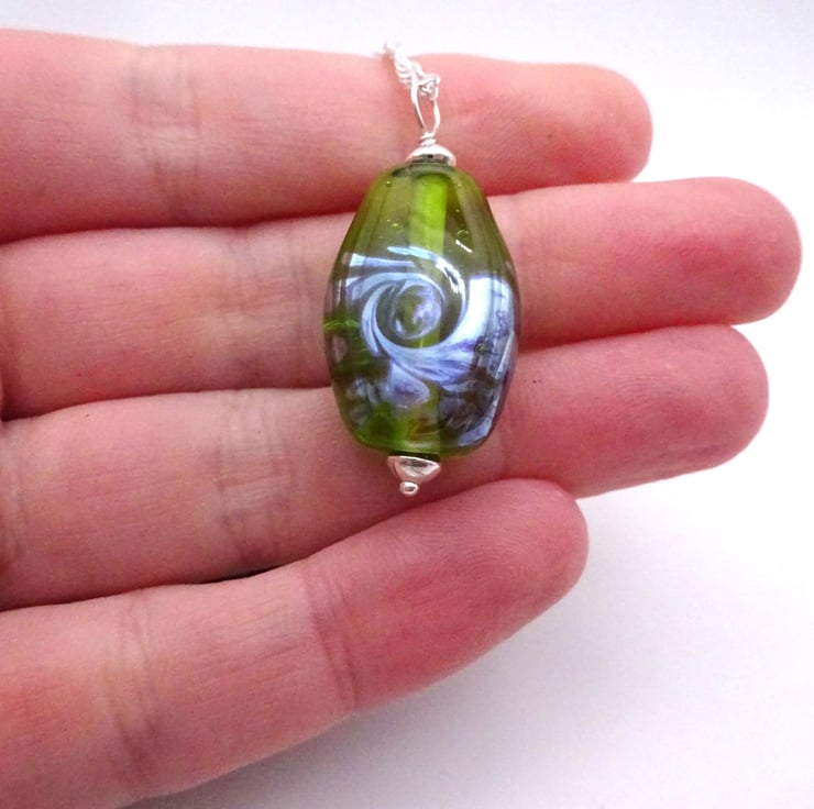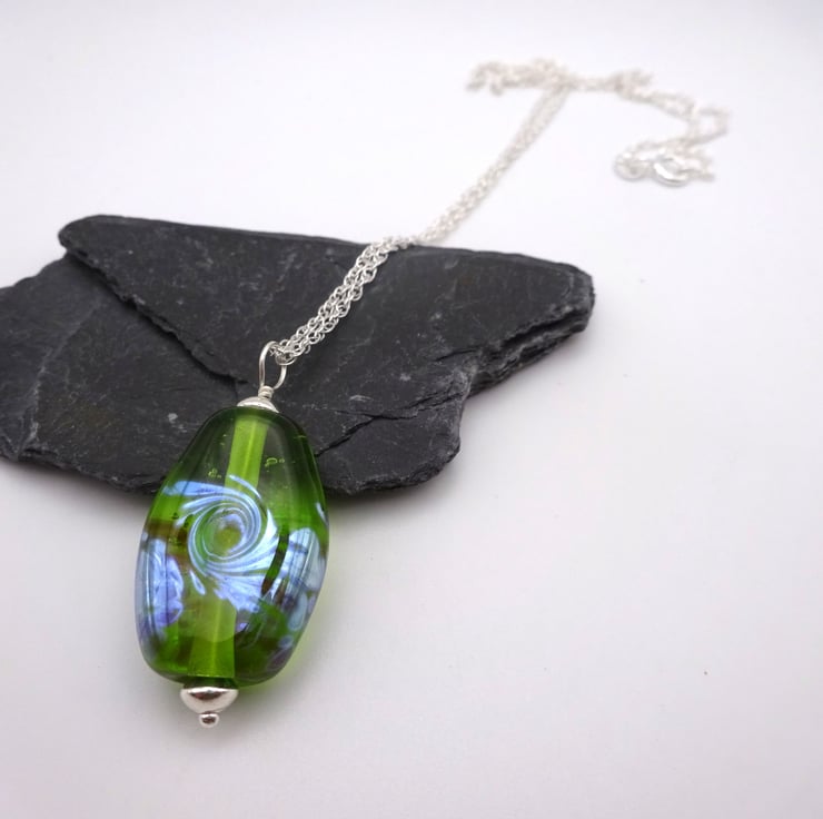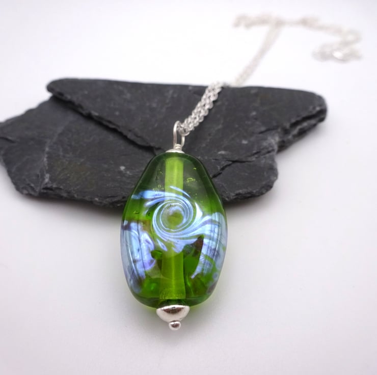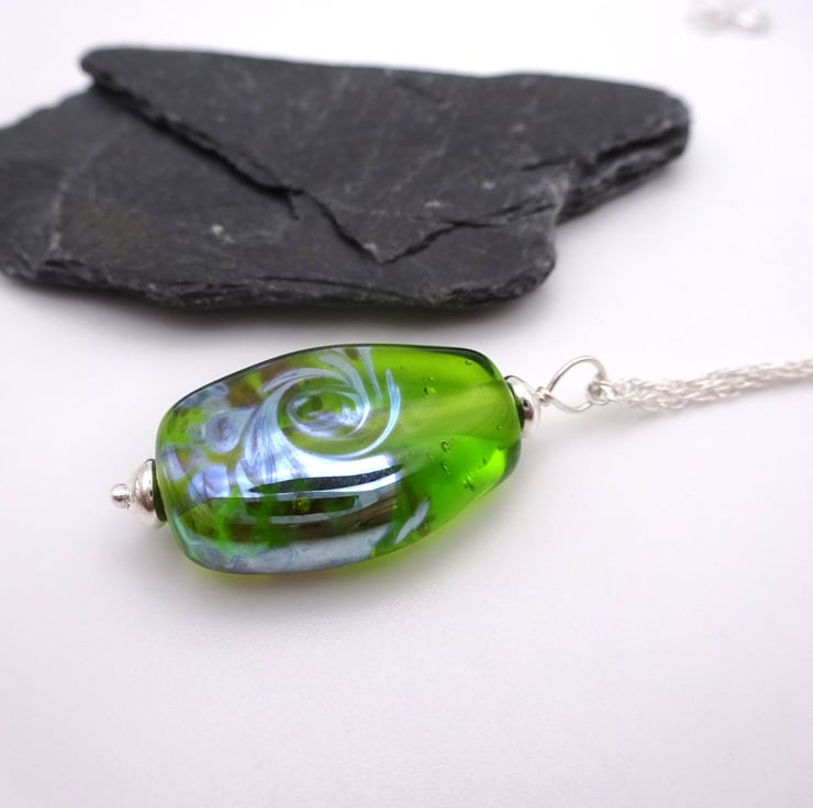 A sterling silver chain which features a handmade lampwork glass green glass pendant. The pendant has been decorated with silver speckles.