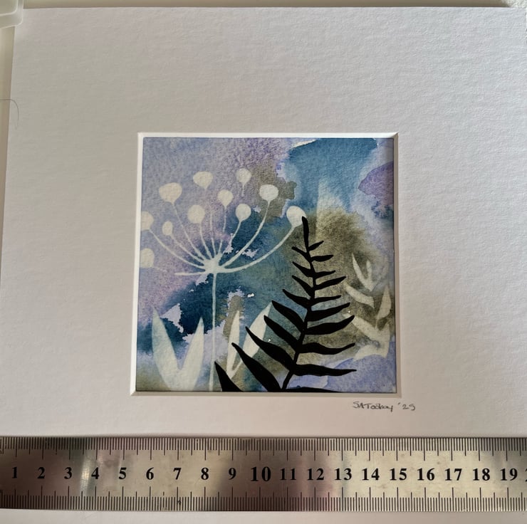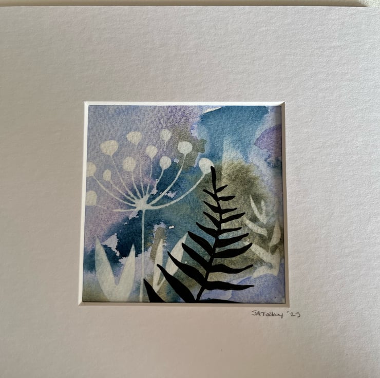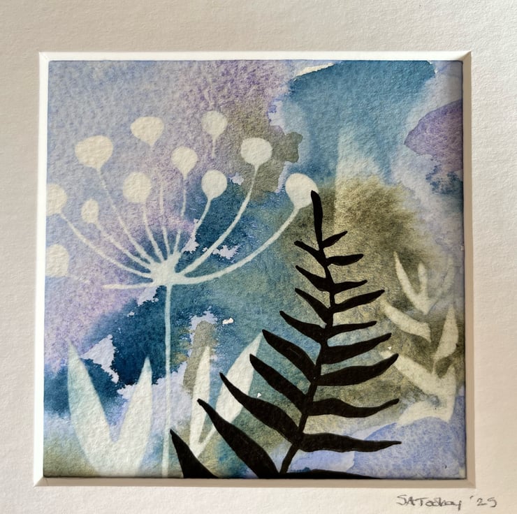 A watercolour and ink painting using reverse stencilling for depth and texture along with beautiful granulating watercolour and hand painted ink flowers. Using the best quality Bockford cotton watercolour paper and mounted in a beautiful deep mount to set off the painting to it’s best advantage.