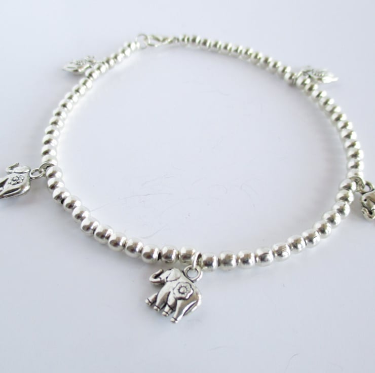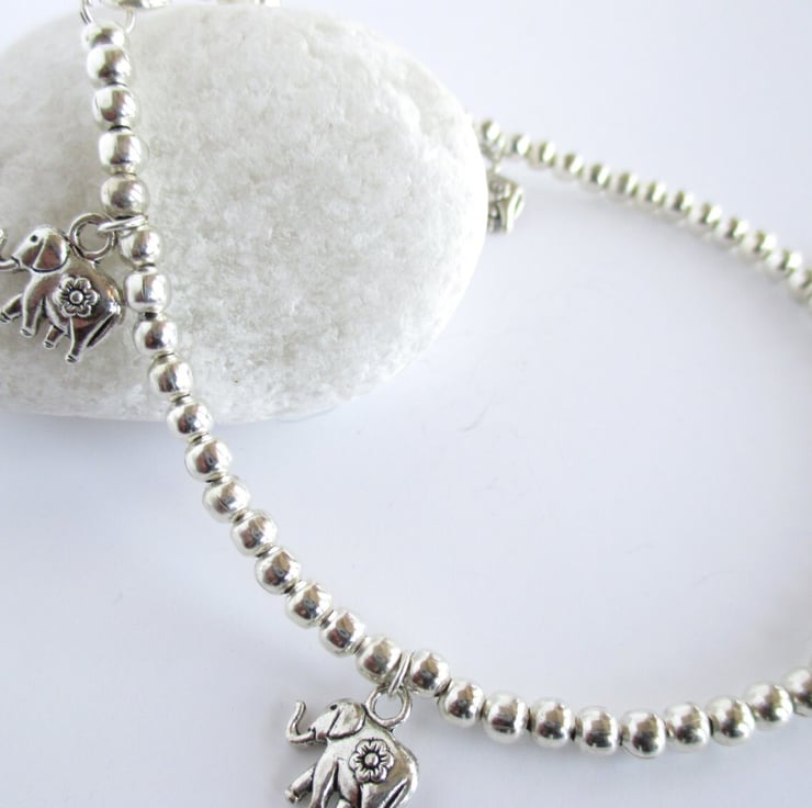 Adorn your ankle with this delightful silver elephant anklet, featuring intricate silver-plated elephant charms and complementary silver-plated beads.
