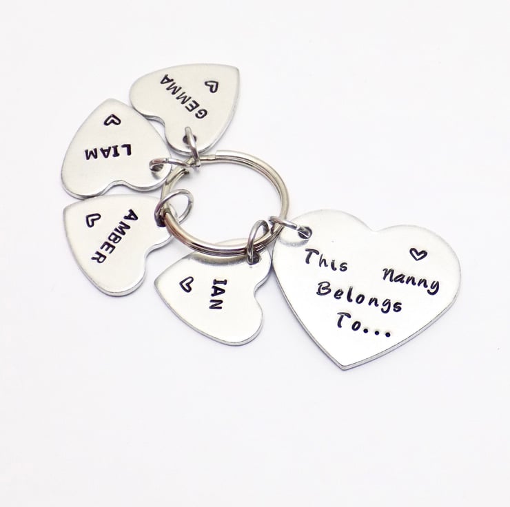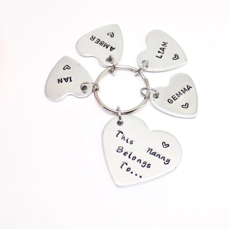 A beautiful handmade gift for a special nanny, this heart-shaped keyring is personalised with your choice of title (Nanny, Nan, Grandma, etc.) and hand stamped name tags for her beloved grandchildren.