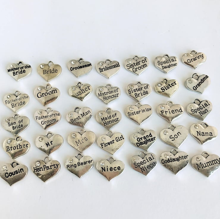 Each charm features a silver heart adorned with a sparkling rhinestone. The hearts are pre-engraved with wedding party titles (such as Bridesmaid, Bride, Maid of Honour), and cannot be customised.