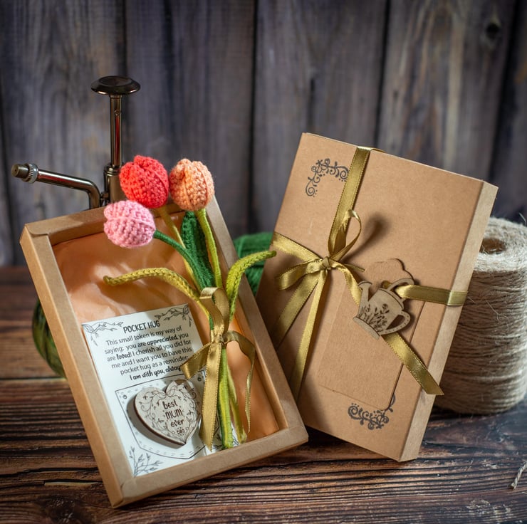 A gift bundle created specifically for Mother's Day or your Mother's Bithday! Consists of a wooden pocket hug, mini tulip bouquet and gift packaging.